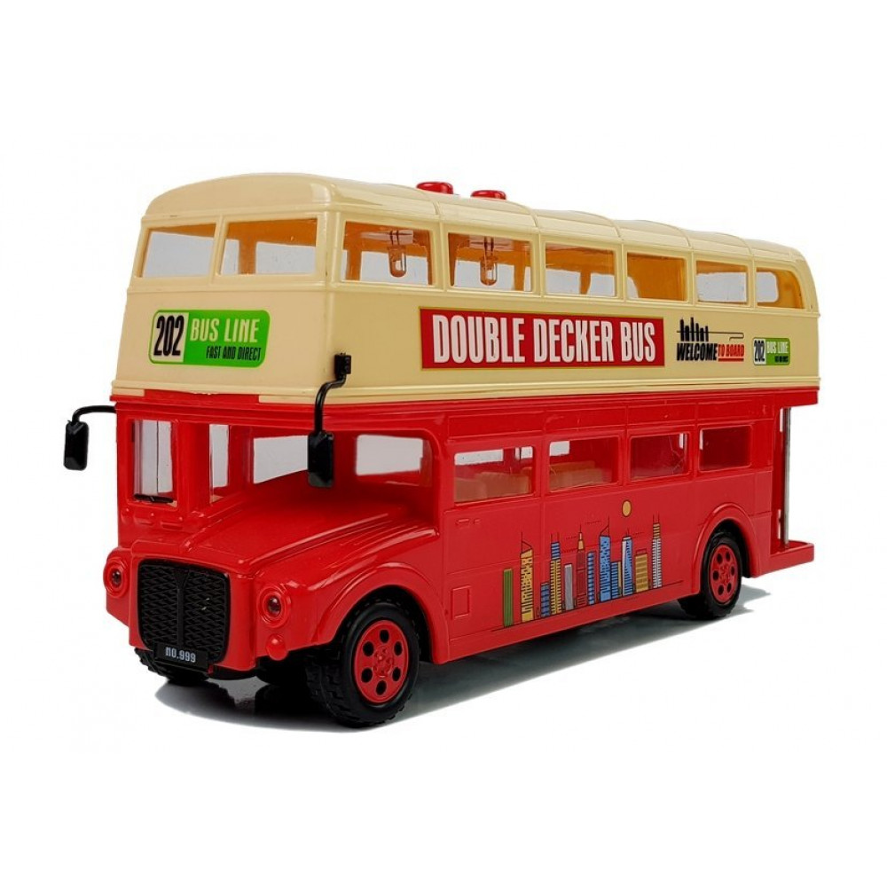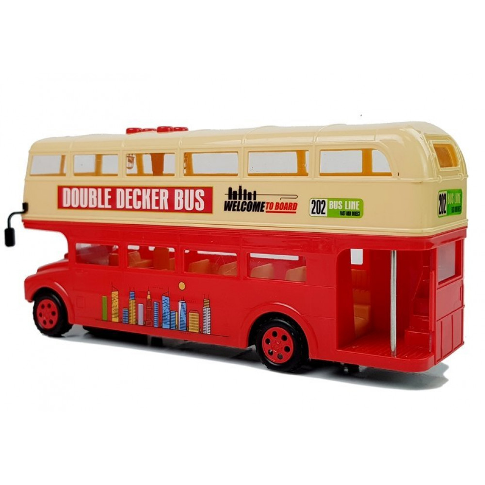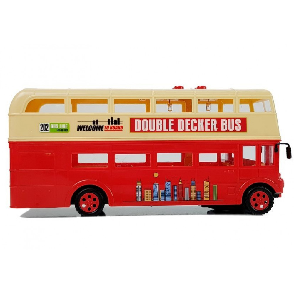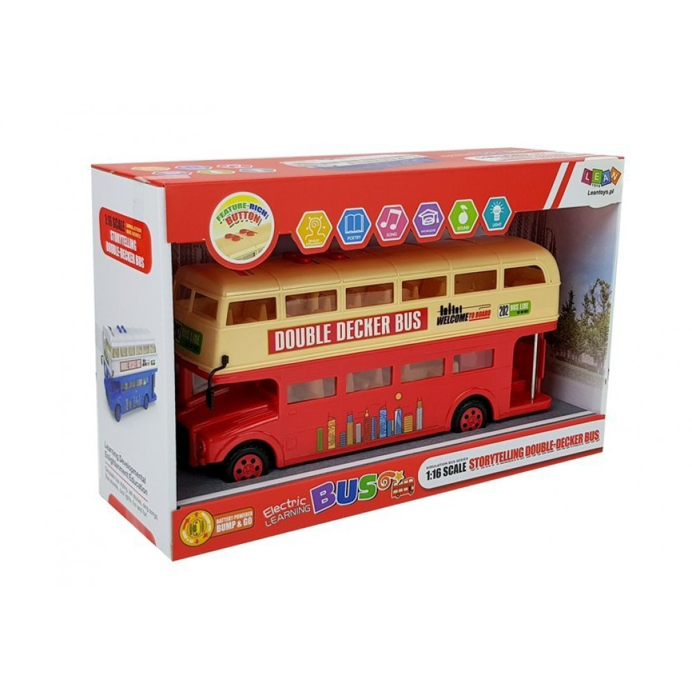 Vyzerá ako skutočný veľký červeno-krémový autobus. Realistický model bol vyrobený s vysokou presnosťou. Zaručuje skvelú zábavu, ktorá rozvíja fantáziu dieťaťa a umožňuje mu spoznať skutočný svet bezpečným spôsobom. Veľkou výhodou autobusu je jeho prvotriedne spracovanie, ktoré zahŕňa dizajn zohľadňujúci najmenšie detaily, ako aj pevný a odolný materiál. Hračka obsahuje sedadlá a volant, takže zábava bude určite lepšia. Ďalšou výhodou autobusu sú 4 tlačidlá na streche, ktoré aktivujú zvuk. Po vložení batérií začne jazdiť. Hračka má dve funkcie. Prvá je jazda so svetelným efektom a hudbou a druhá je určená na výučbu angličtiny.