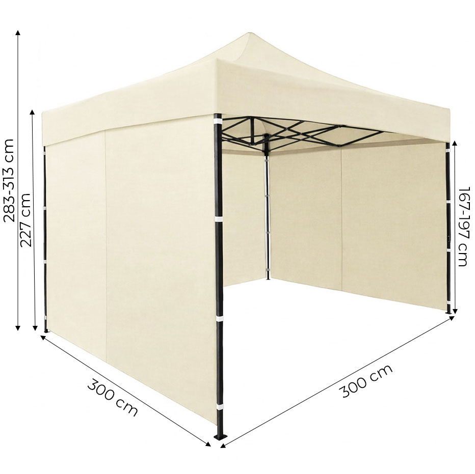 - 4-stupňové nastavenie výšky umožňuje ľahko prispôsobiť konštrukciu pavilónu rôznym potrebám používateľa a podmienkam okolia. Vďaka jednoduchému systému zmeny výšky rámu je možné zväčšiť priestor pod strechou alebo prispôsobiť výšku stanu charakteru podujatia, čím sa zabezpečí pohodlie pri používaní a väčšia funkčnosť. Rozsah nastavenia: 283/293/303/313 cm.