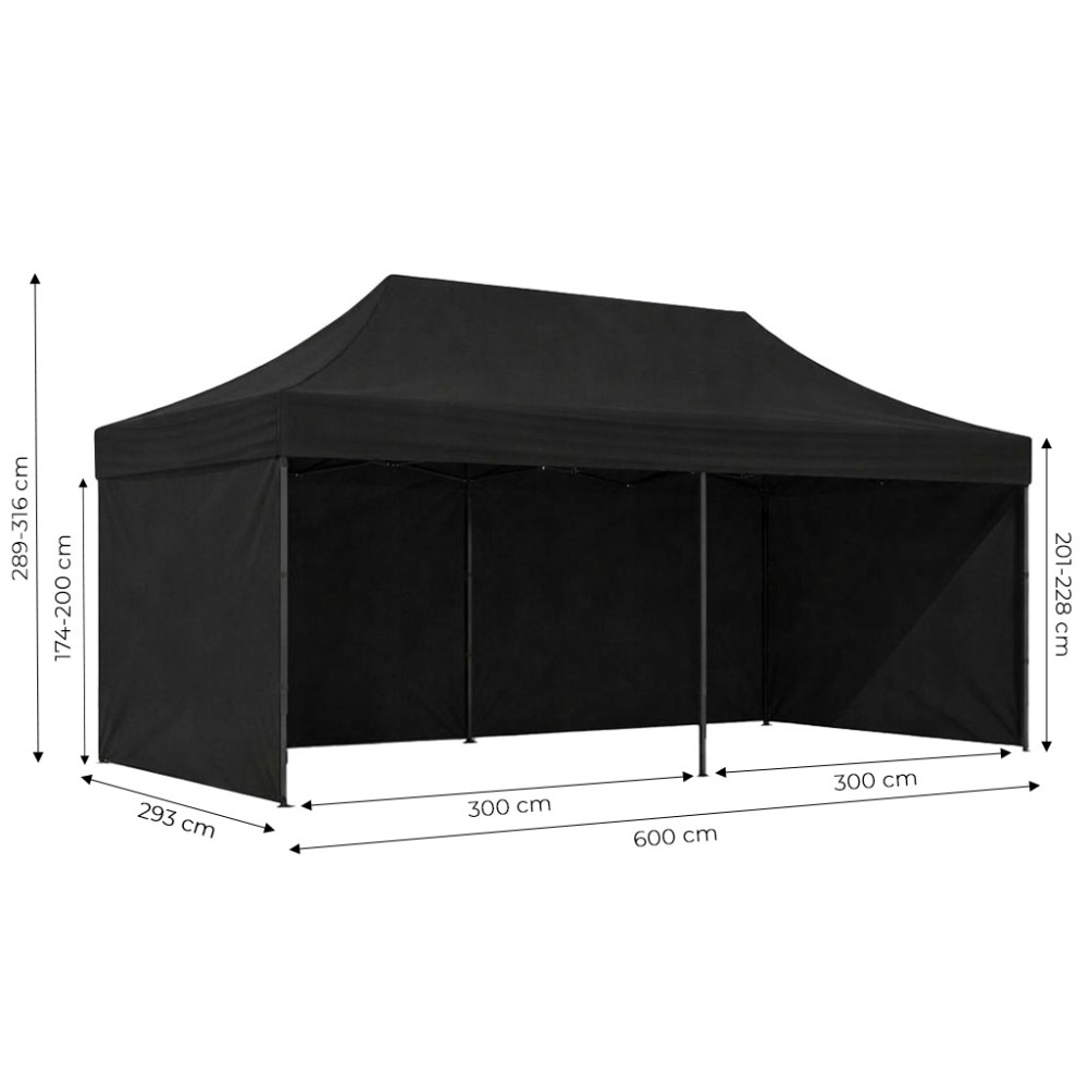 - 4-stupňové nastavenie výšky umožňuje ľahko prispôsobiť konštrukciu pavilónu rôznym potrebám používateľa a podmienkam okolia. Vďaka jednoduchému systému zmeny výšky rámu je možné zväčšiť priestor pod strechou alebo prispôsobiť výšku stanu charakteru podujatia, čím sa zabezpečí pohodlie pri používaní a väčšia funkčnosť. Rozsah nastavenia: 289/298/307/316 cm.