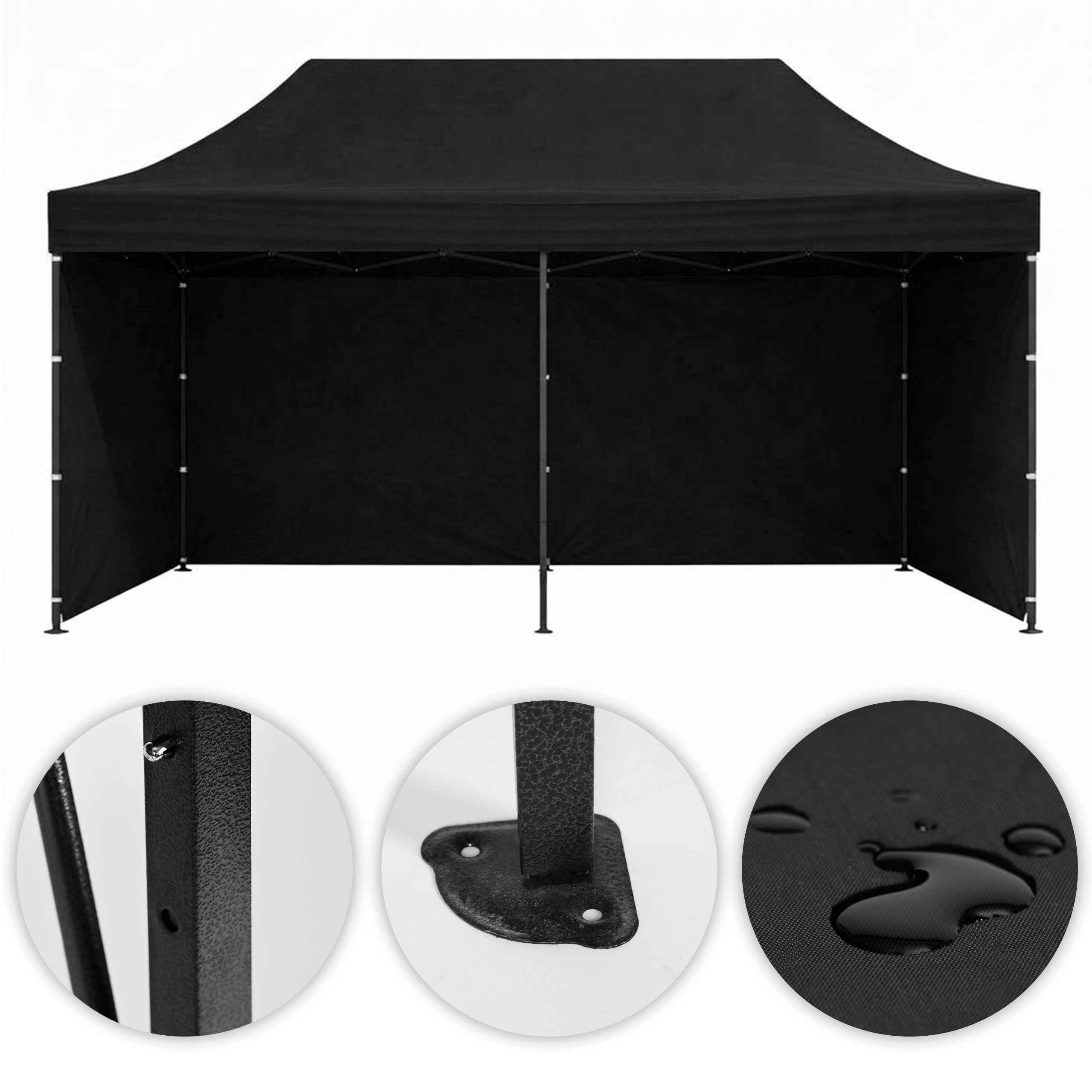 - Plášť jevyrobený z odolného materiálu PVC 420D – strecha a 210D, ktorýje odolný voči dažďu a UV žiareniu, preto sa dobre osvedčuje pri stretnutiach v záhrade, podujatiach pod šírym nebom alebo sezónnej obchodnej činnosti.