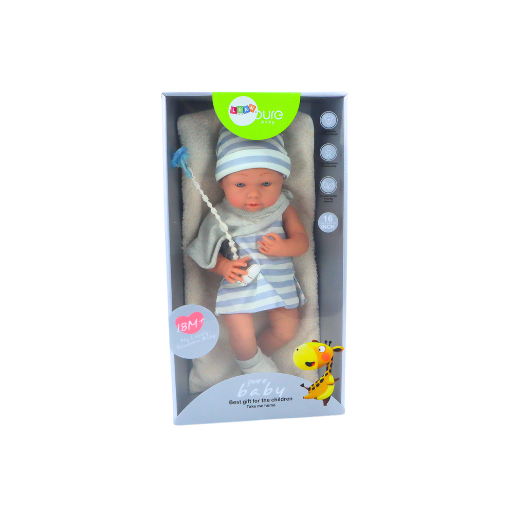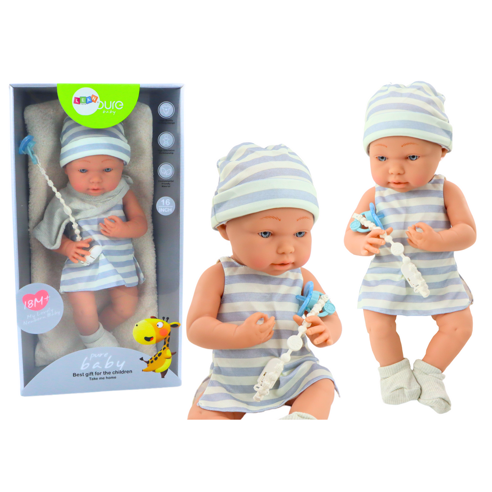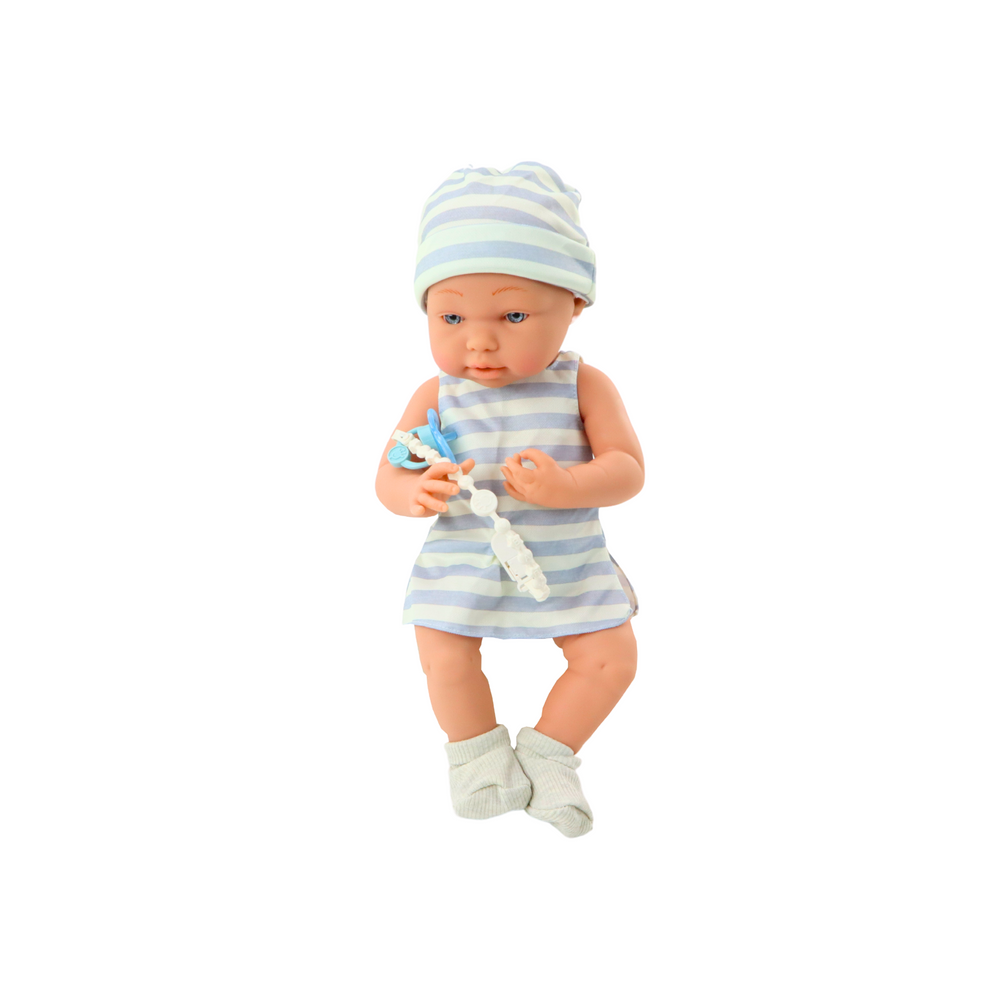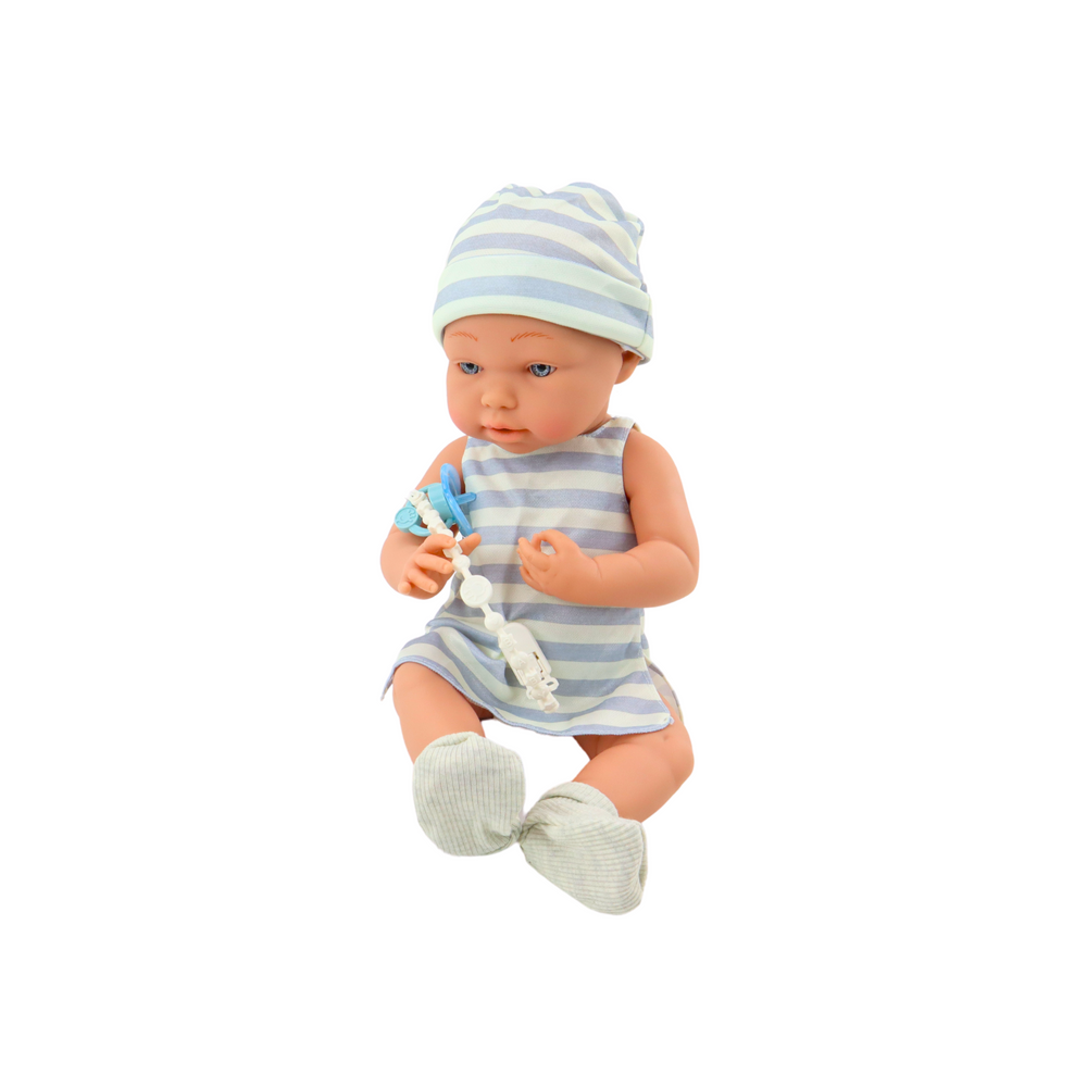 je oblečená v bielo-modrom pyžamku, podbradníku, ponožkách a čiapočke. Bábika