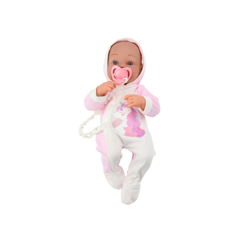 má na sebe bielo-ružové body s motívom jednorožca a kapucňou. Má pohyblivé ruky