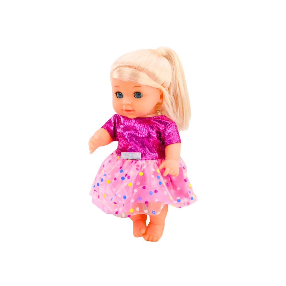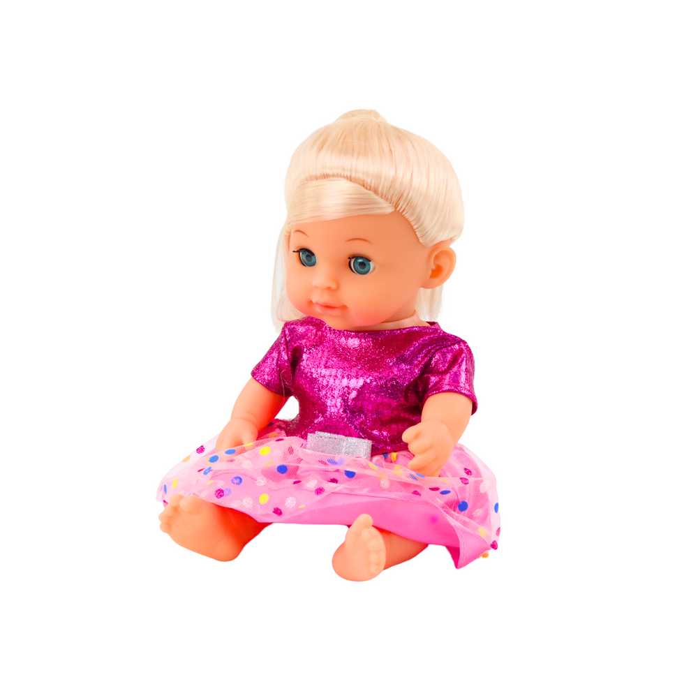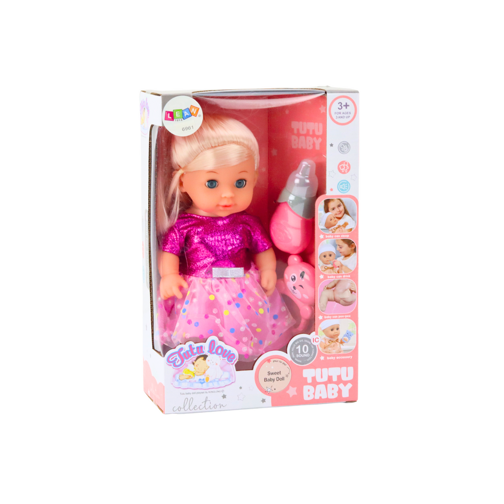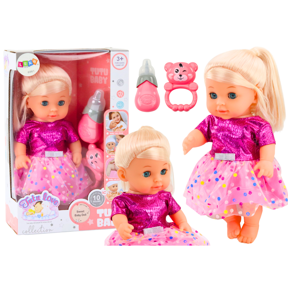 Bábika v ružových šatách, cikajúca – zvukové efekty