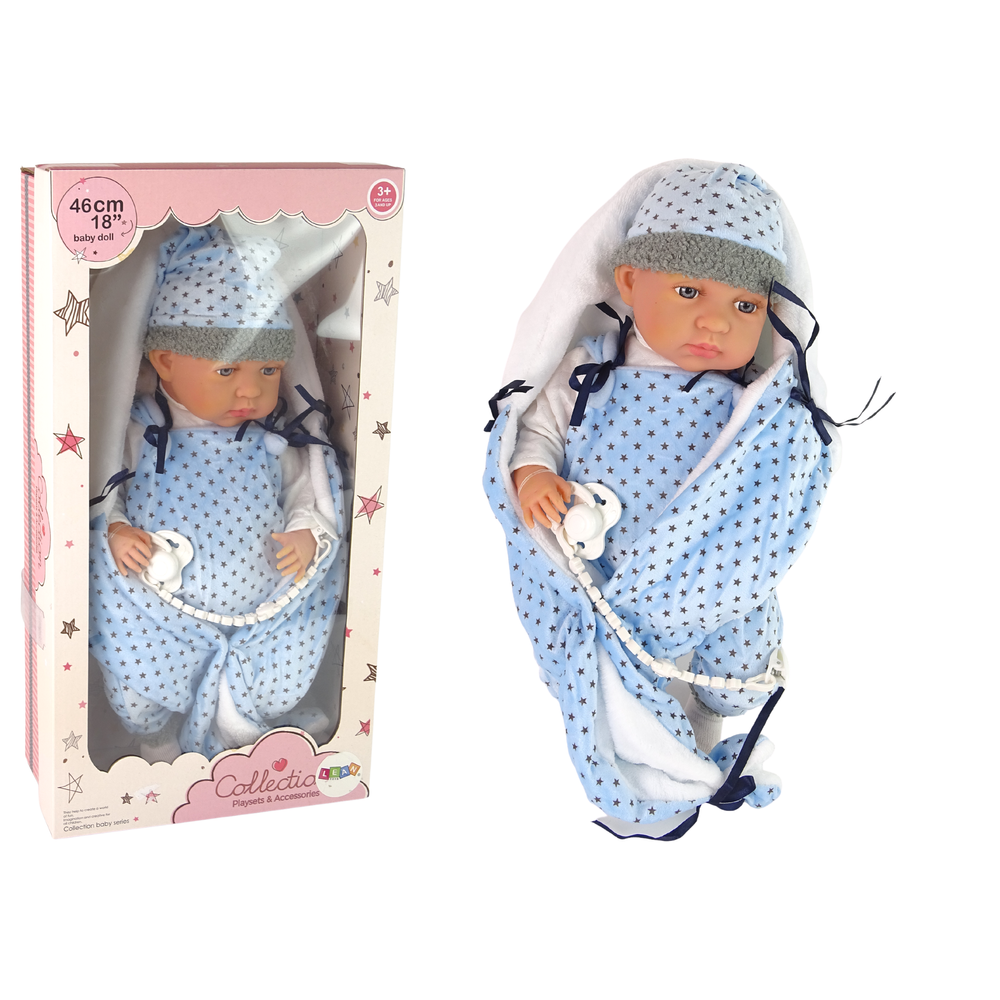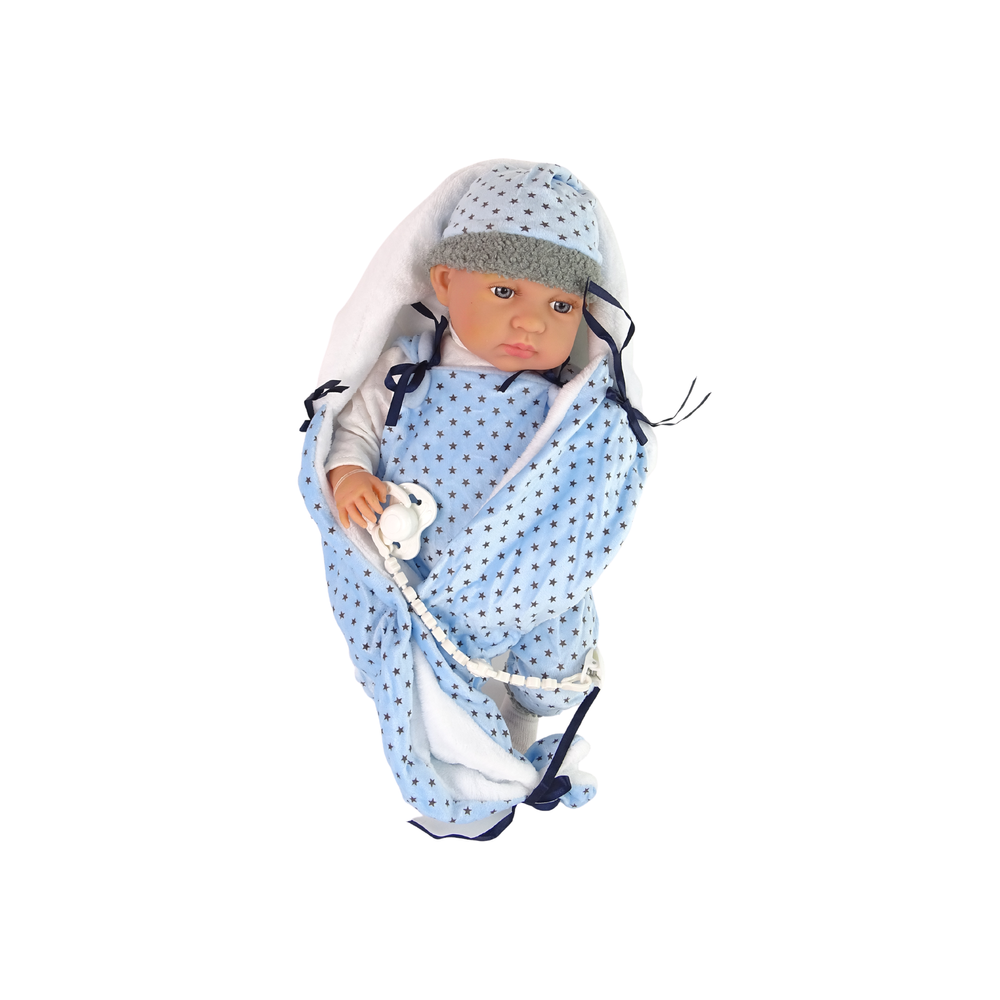 Bábika v zavinovacej deke – modrá 46 cm