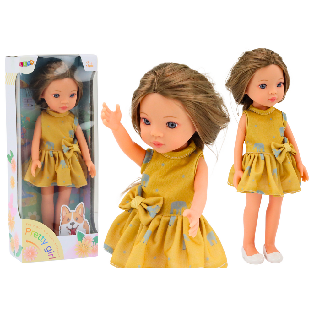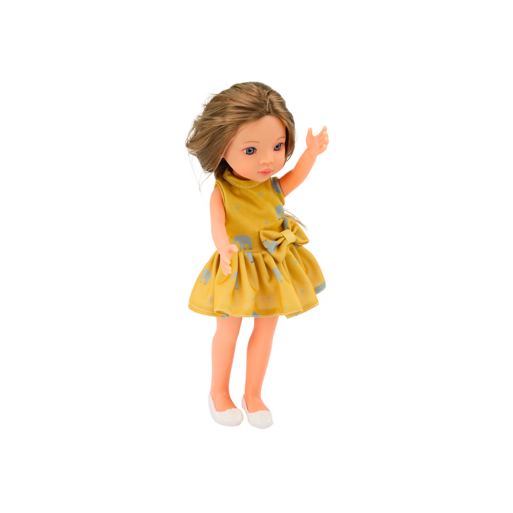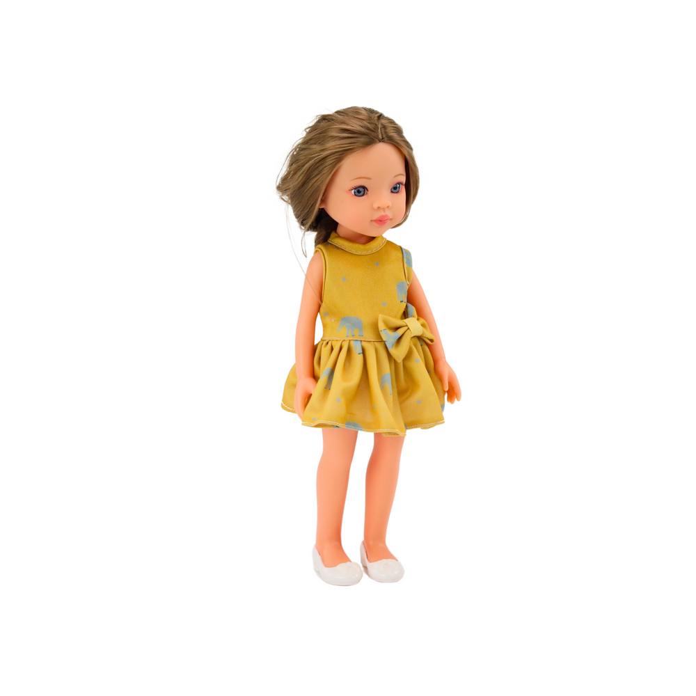 zdobené mašľou a vzorom slona. Šaty sú farebné a ladné, čo dodáva bábike veselý