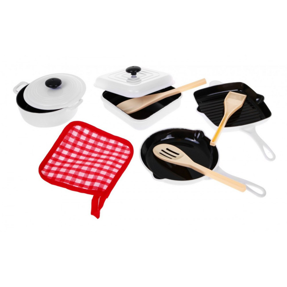 | - štvorcový hrniec cca 21 cm x 13 cm, - guľatá panvica cca 19 cm x 13 cm, - štvorcový hrniec s vekom,cca 12 cm x 6 cm, - kruhový hrniec s vekom cca. 13 cm x 5 cm, - handrička cca 12 cm x 12 cm, - panva cca. Výška 17 cm, - plece vysoké asi 17 cm, - lyžica cca Výška 17 cm. |