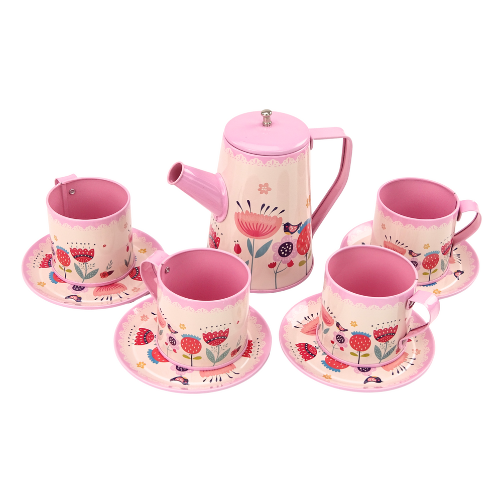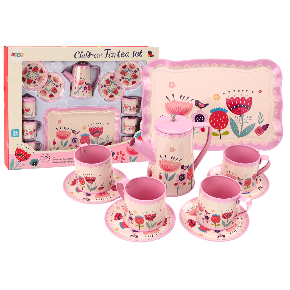 obsahuje elegantný podnos, čajník, štyri šálky, štyri podšálky a štyri veľké