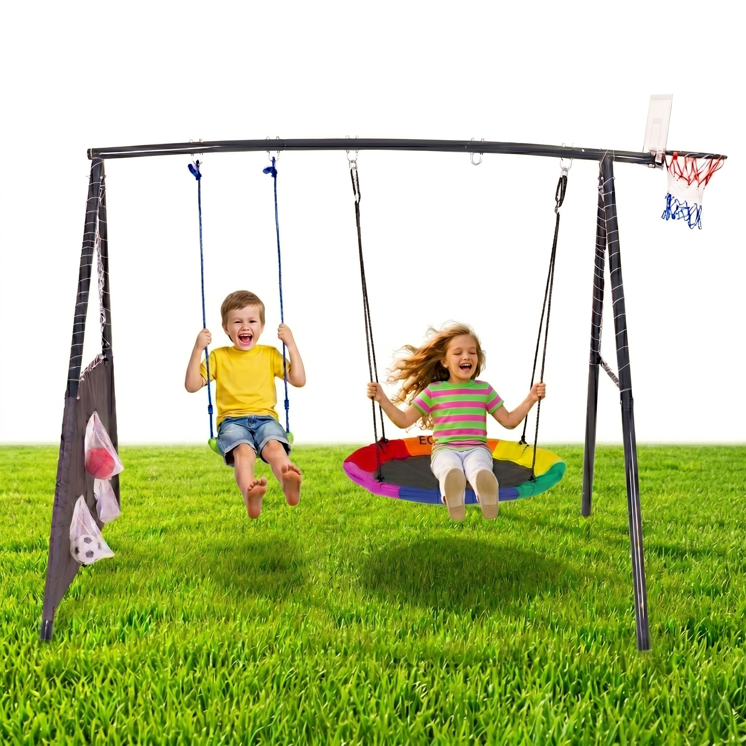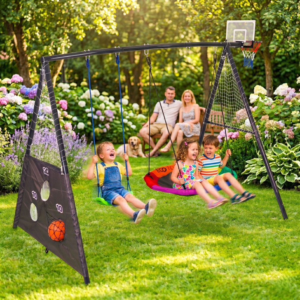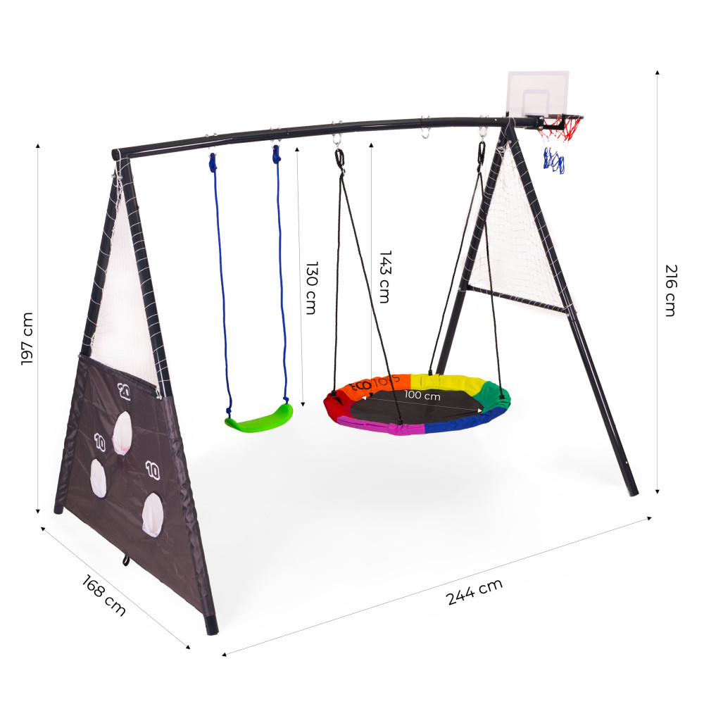 Detské ihrisko je ideálnym riešením na vytvorenie priestoru plného pohybu a radosti v záhrade, kde deti môžu bezpečne tráviť čas na čerstvom vzduchu. Skvele sa hodí na každodenné hry, rodinné stretnutia alebo letné dni na záhrade, pričom ponúka rôznorodé formy aktivít najednom mieste. Vďaka oceľovej konštrukcii s práškovým náterom je celok stabilný a zároveň odolný voči poveternostným vplyvom, vďaka čomu dobre zvládne intenzívne používanie. Je to skvelá alternatíva k času strávenému pred obrazovkou, ktorá povzbudzuje deti k aktivite a budovaniu zdravých návykov.