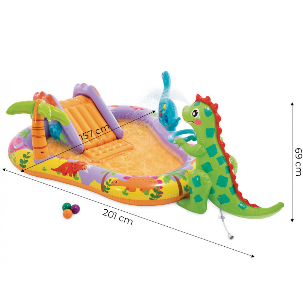 Ihrisko bolo obohatené o roztomilého nafukovacieho dinosaura , ktorý poskytuje ešte viac zábavy! Deti môžu hádzať priložené loptičky do vstavaného krúžku , čím si precvičujú presnosť a motorickú koordináciu. Dinosaurus má navyše zabudovanú vodnú fontánu , ktorá sa jednoducho pripojí k záhradnej hadici a vytvorí osviežujúcu vodnú hmlu v horúcich dňoch.