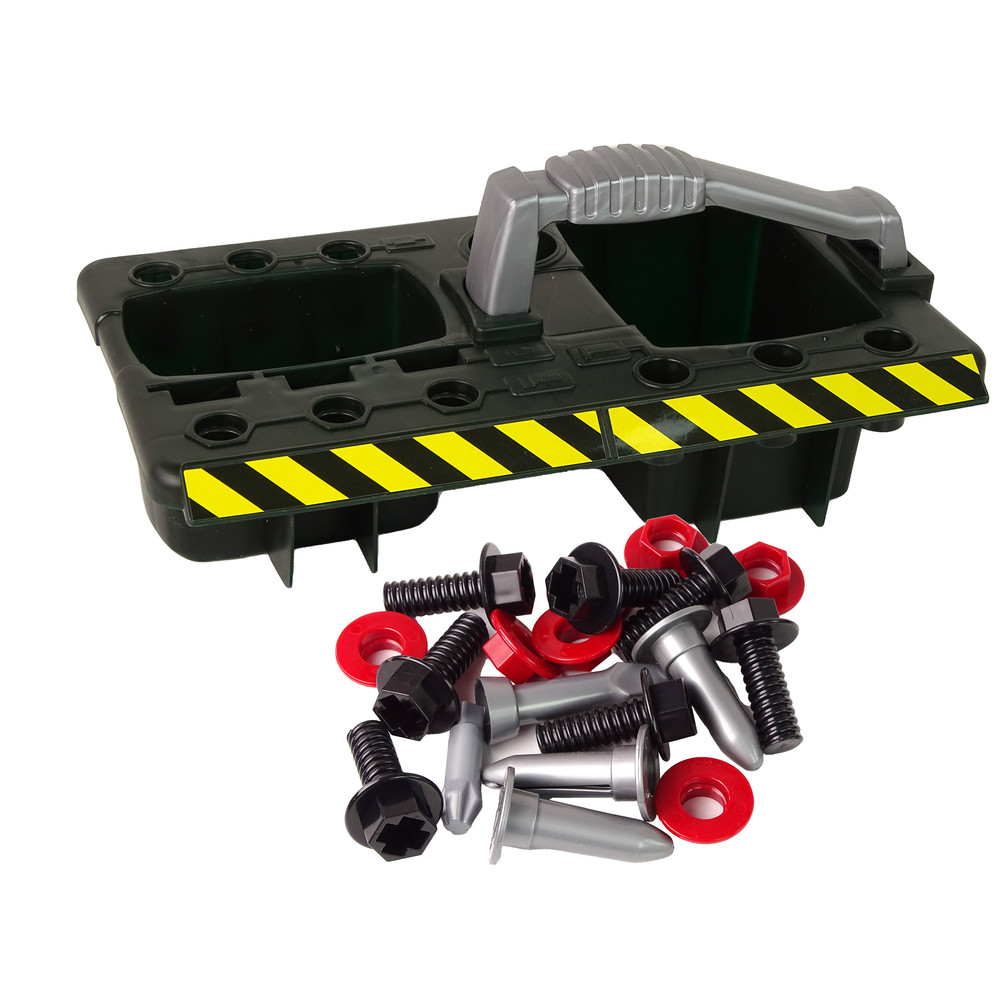 skrutky a matice. Všetky nástroje sú vyrobené z plastu. Skrutkovač je