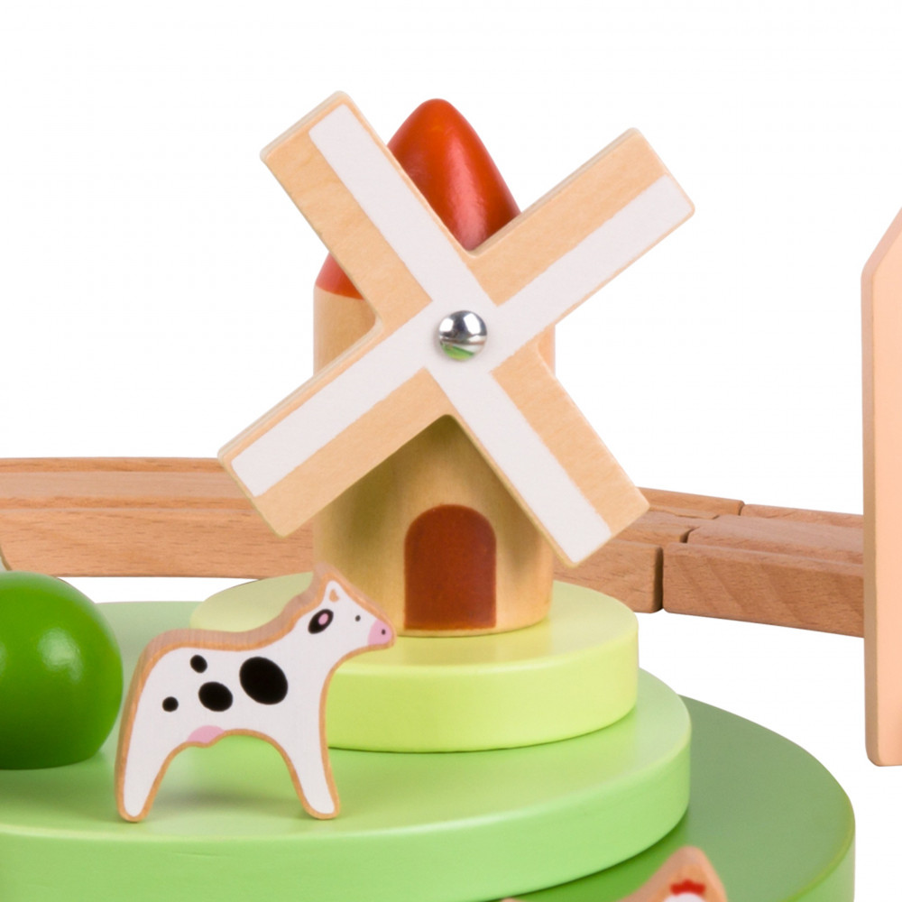 sada obsahuje drevenú dráhu, vláčik s vagónmi, stanicu, mlyn, figúrky