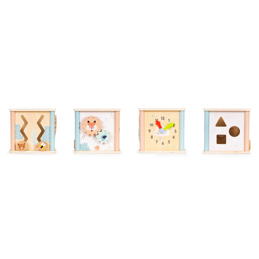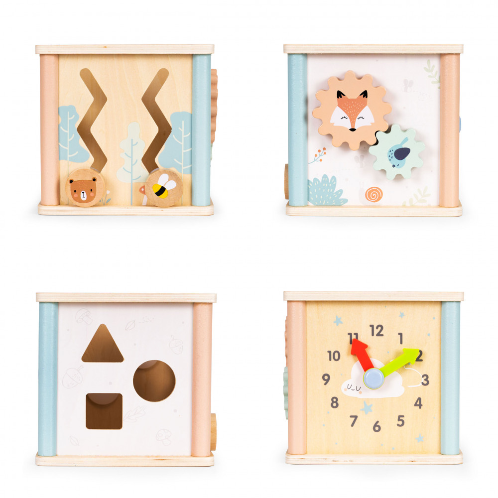 - Na bokoch steny sa vaše batoľa môže hrať s triedičom tak, že si zladí vhodný tvar kociek. Ďalšie steny kocky majú bludisko, otočné ozubené kolesá a hodiny s pohyblivými ručičkami.