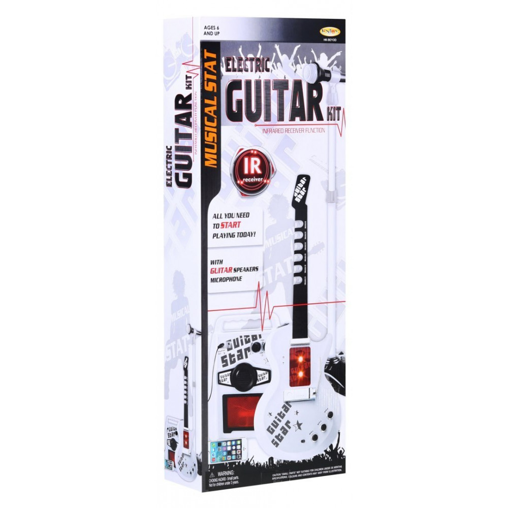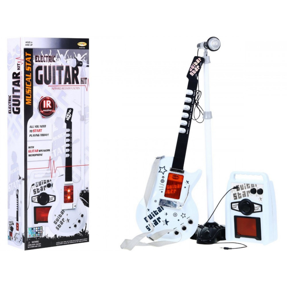 | - gitara s nastaviteľným remienkom (napájaný 3 AA 3 x 1,5 V batériami - nie je súčasťou balenia), - mikrofón zosilňujúci hlas, - nastaviteľný stojan (2 úrovne), - nastavenie úrovne mikrofónu, - kábel MP3, |