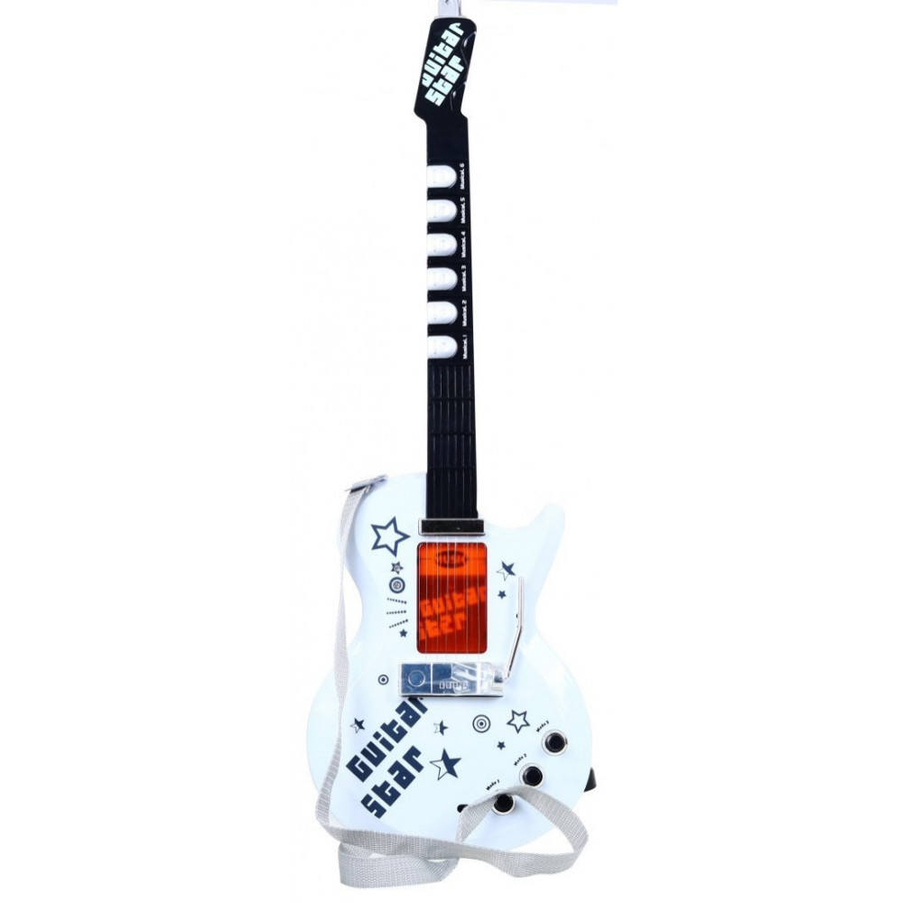 Popis | Predstavujeme Vám detskú elektrickú gitaru, ktorú si zamiluje každé dieťa, ktoré má rado hudbu. Je vybavená 6 kovovými strunami, 3 tónmi gitary, 7 melódiami a 12 krátkymi sólami. |