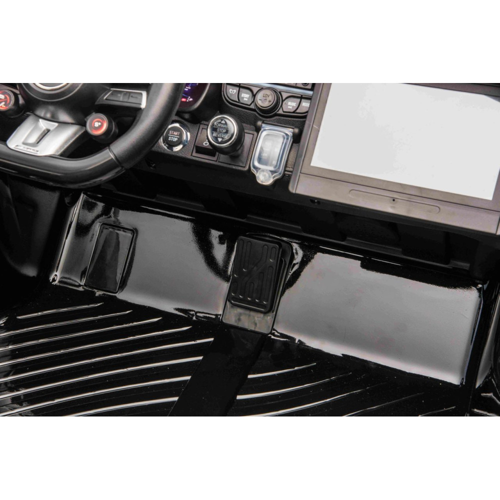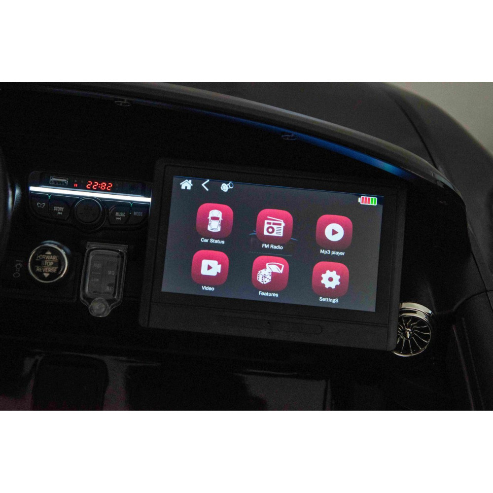 Audio Diaľkové ovládanie | USB, MP3, BLUETOOTH, predinštalované melódie, tlačidlá zvuku a klaksónu na volante, Nový typ panela MP4 s režimom SPORT (vozidlo vydáva zvuky pri stlačení plynového pedálu) 2,4 GHz, 3 rýchlosti, bezpečnostné tlačidlo STOP |