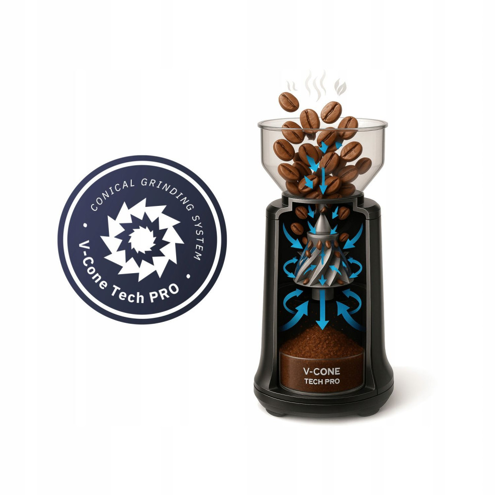 - Technológia V-Cone a oceľové kužeľovémlynčeky zabezpečujú rovnomerné mletie zŕn. Toto riešenie prispieva k lepšej extrakcii kávy, zdôrazňuje jej arómu a chuť a zároveň zaručuje vysokú životnosť a spoľahlivosť zariadenia.