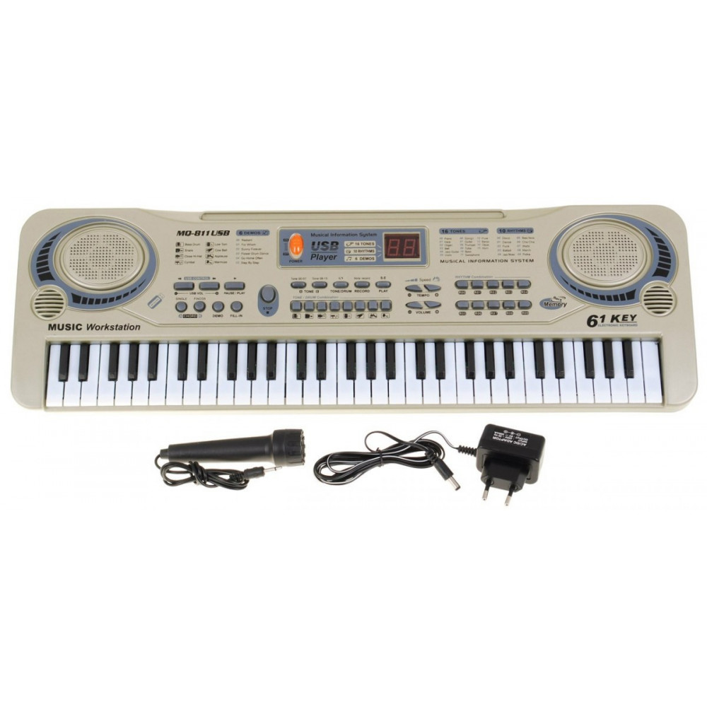 - digitálny displej, - 16-tónové ovládače (napr. klavír, violončelo, jazzová gitara, trúbka, saxofón, flauta, hoboj ...), - tlačidlá, ktoré aktivujú 10 rytmov (napr. valčík, funk, balada, disco, jazz ...), - tlačidlá, ktoré aktivujú bicie, - tlačidlo demo (6 melódií), - ovládacie tlačidlá / hlasitosť MP3, - tlačidlá ovládania hlasitosti, - tlačidlá na nastavenie tempa, - tlačidlo štart / stop, - tlačidlo nahrávania, - programovacie tlačidlo, - tlačidlo SE / PLAY, - výstup mikrofónu - port USB, - reproduktor - mikrofón - napájanie.