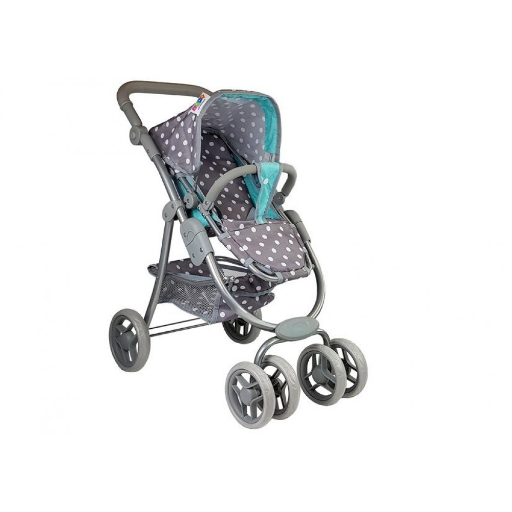 vozík je sivý s bielymi bodkami s tyrkysovými prvkami, dodáva veľa
