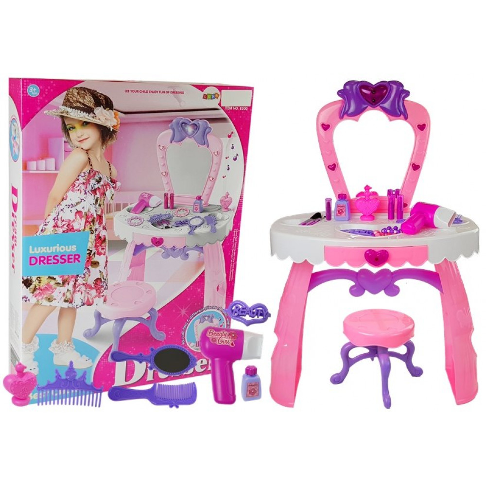 Toaletný stolík je skvelým tipom na darček pre malé dievča, ktoré sníva o tom, že sa v budúcnosti stane kozmetičkou. Pôvabná ružová súprava s bielymi a fialovými prvkami umožní každej princeznej hrať sa pred zrkadlom už od samého rána. Hračka bola navrhnutá s ohľadom na najmenšie dievčatá, a preto bola vyrobená z certifikovaných a úplne bezpečných materiálov. Dizajn stolíka a vzory dodávajú štýl a eleganciu.