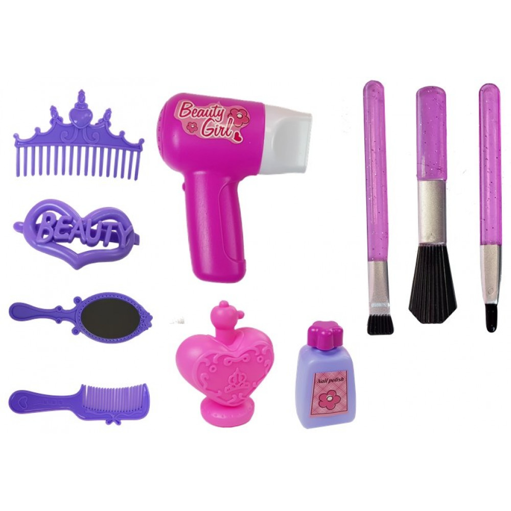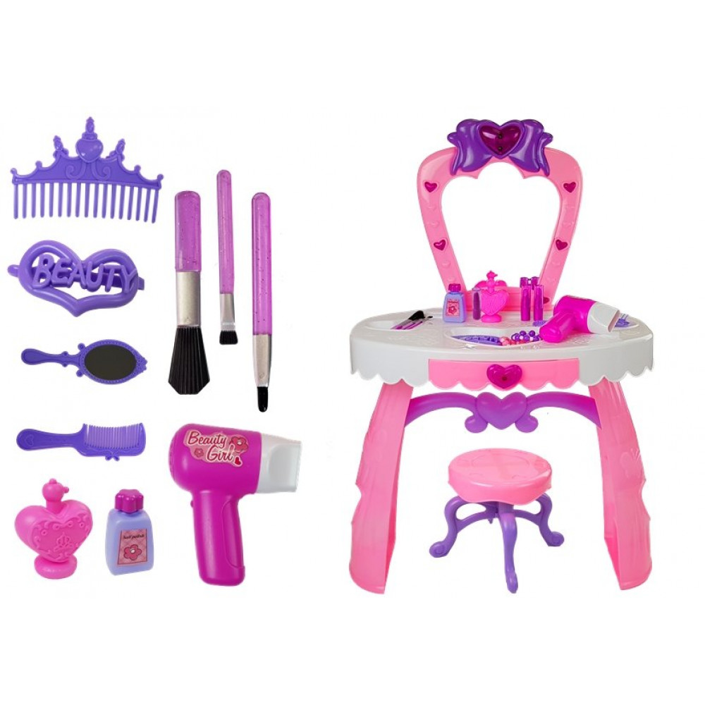 Súčasťou súpravy je aj krásna stolička s priemerom 20 cm. Pracovná plocha má na vrchnej strane výklenky pre príslušenstvo a výsuvnú zásuvku, ktorá uľahčuje ukladanie drobností, ako sú spony do vlasov. Sada obsahuje príslušenstvo, ktoré určite poteší každé malé dievčatko, a tým rozširuje možnosti hry.