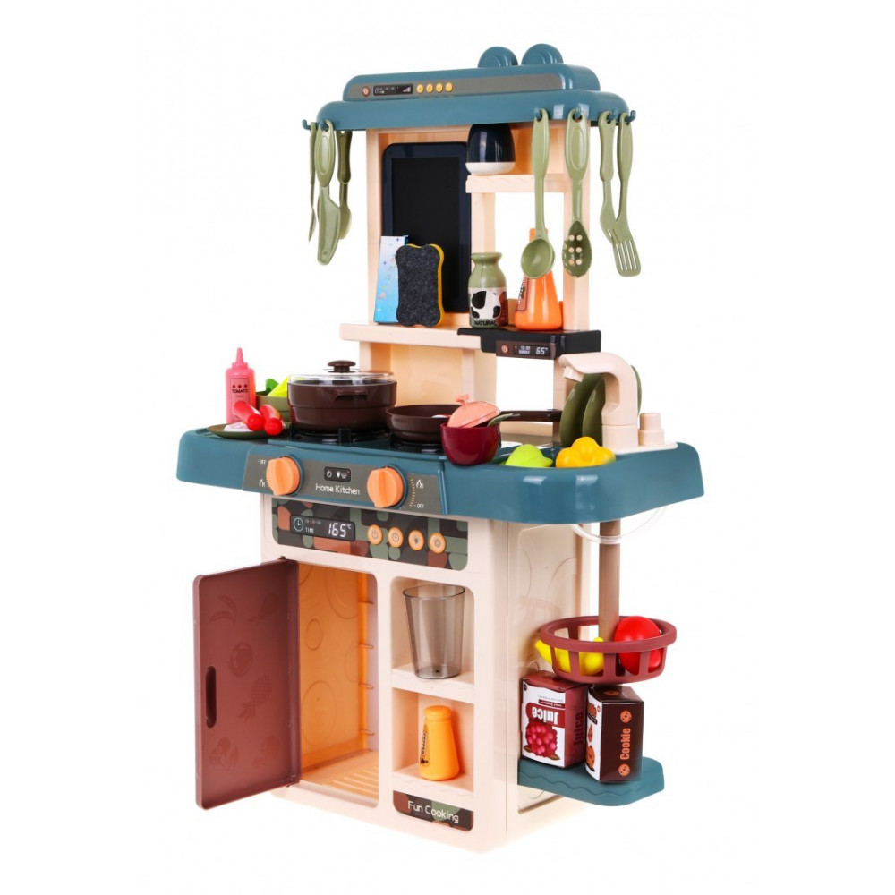 má kohútik s drezom, z ktorého tečie voda, osvetlené horáky so zvukmi varenia a