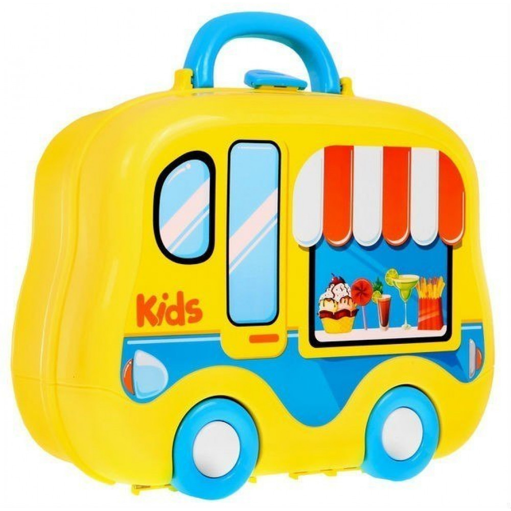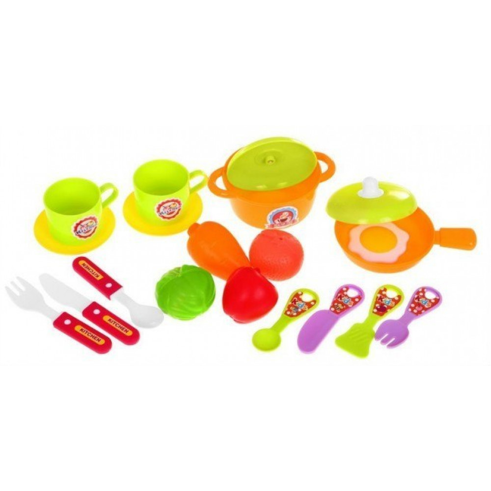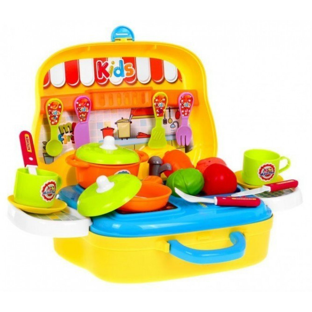 | - prenosný skladací kufrík v tvare autíčka na kolieskach, - stolová doska s imitačným indukčným sporákom, - 2 bočné police, - vešiak na riad, - hrniec s vekom, - panvica s vekom, - 2 taniere, - 2 šálky, - 2 vidlice (menšie a väčšie), - 2 lyžičky (väčšie a menšie), - 2 nože (menšie a väčšie), - štítok na vyprážanie, - kohútik, - zelenina a ovocie (paprika, mrkva, kapusta, pomaranč), - vyprážané vajíčko, - farebné balenie, ideálny na darček. | |
