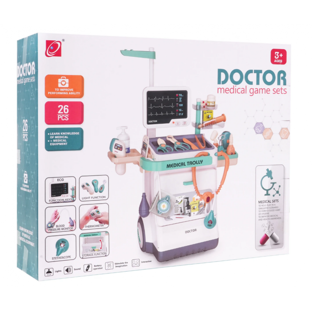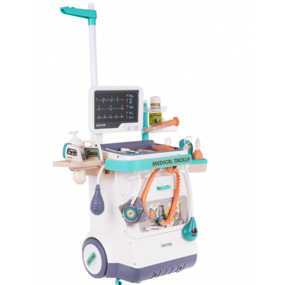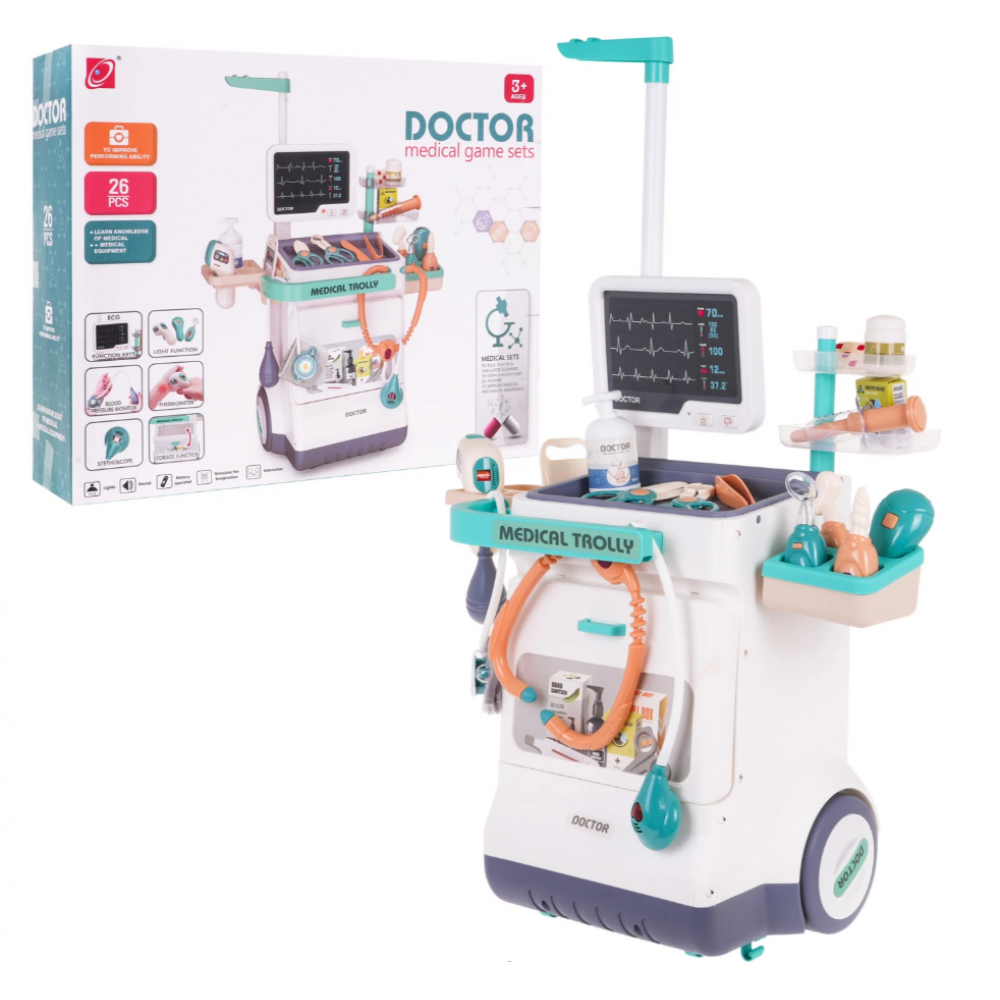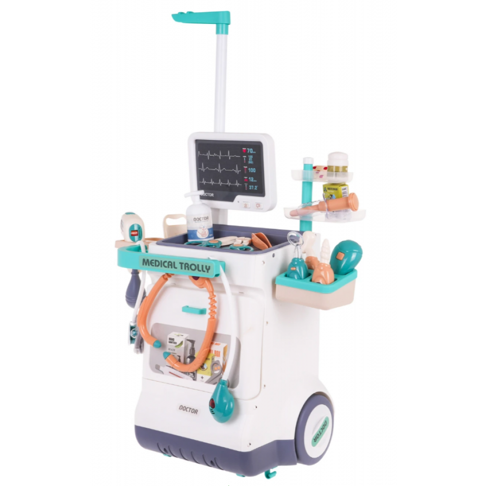 Interaktívna, dobre vybavená lekárska súprava s lekárskym vozíkom a príslušenstvom.