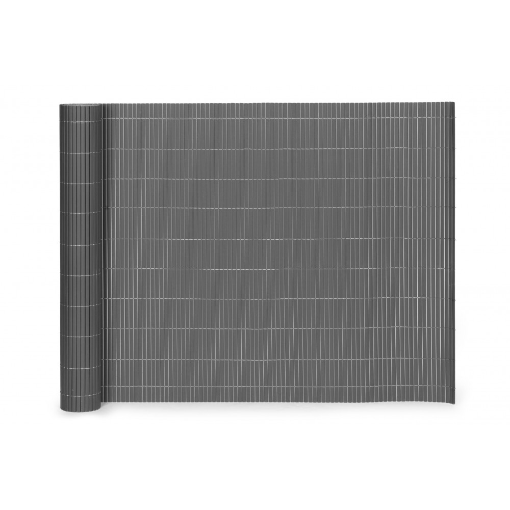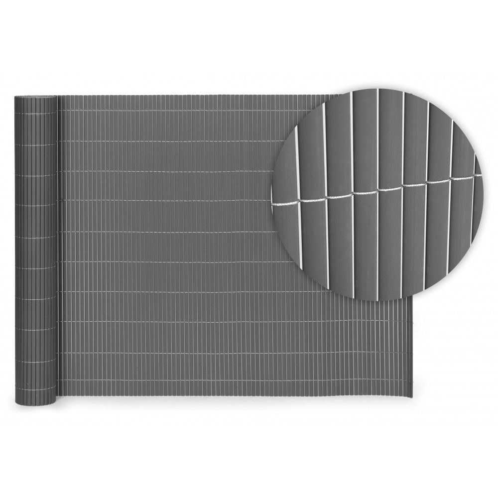 Bambusová podložka je vyrobená z odolného PVC materiálu, vďaka ktorému je odolná voči UV žiareniu, nenasiakne vodu pri daždi a účinne ju chráni pred nárazmi vetra, čo zvyšuje komfort používania. Vďaka svojej štruktúre imitujúcej prírodný bambus v elegantnej antracitovej farbe slúži rohož nielen ako praktický kryt, ale aj ako estetický dizajnový prvok.