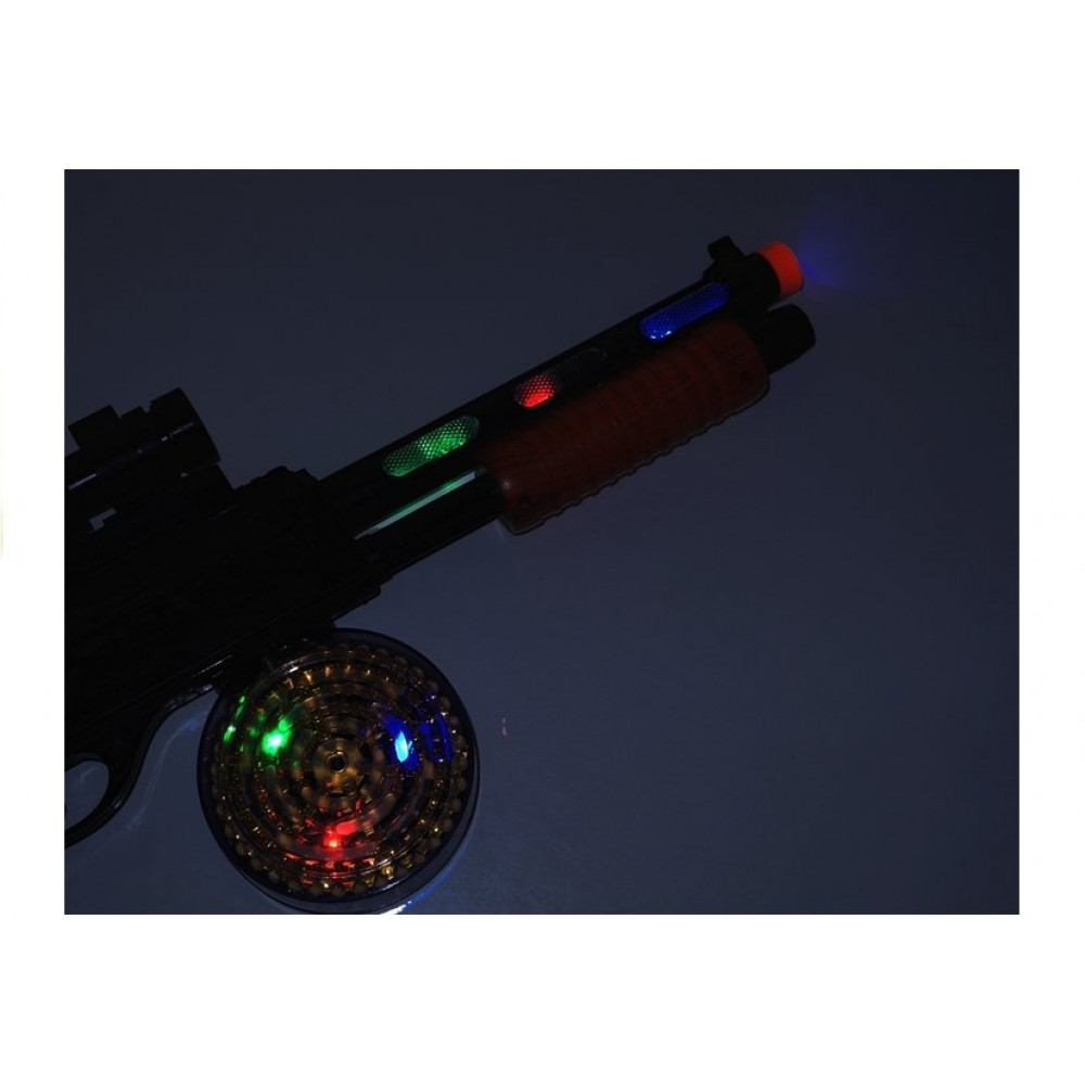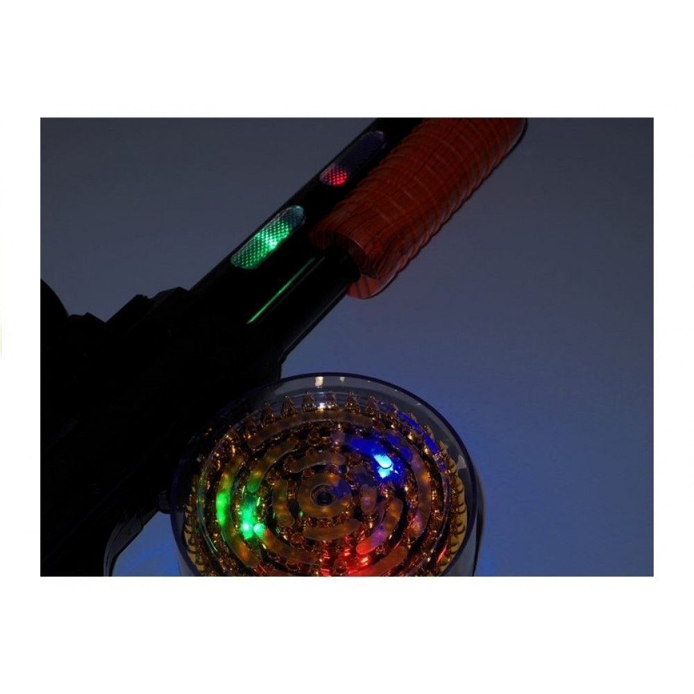 Puška AK-868 vyzerá skvele! Čierna štruktúra hračky je kombinovaná s hnedými prvkami napodobňujúcimi drevo, ako aj malou nádobkou na lesklé zlaté náboje. Je zaujímavé, že nádoba sa dá otáčať okolo svojej osi. V hornej časti pušky môžete ľahko namontovať zameriavač, ktorý je dodávaný so súpravou, vďaka čomu zameranie na vybraný cieľ nebude pre vaše dieťa nikdy problémom. Pažba zbrane je zakončená kontrastným oranžovým detailom so svietiacou diódou v strede, zatiaľ čo jej štruktúra obsahuje tri priehľadné panely, ktoré svietia pri zapnutí hračky červeno, zeleno a modro.. Okrem senzačných svetelných efektov sú veľkou výhodou detskej pušky aj zvuky, ktoré hru sprevádzajú. Tieto doplnky spestria každú z hier, vďaka čomu sa chlapci nebudú môcť na dlhý čas odtrhnúť od svojich interaktívnych pušiek.