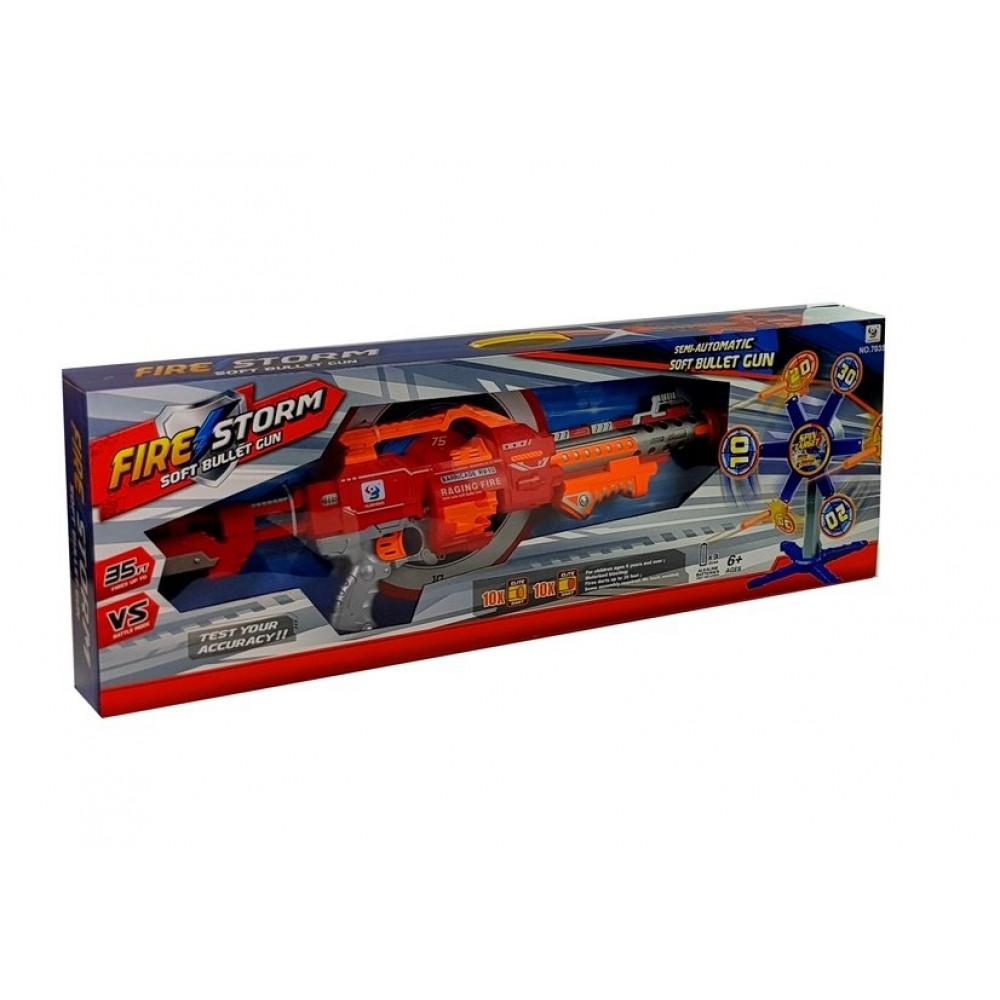 Pištoľ s penovými nábojmi a rotujúcim terčom