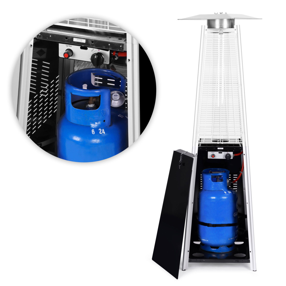 Ohrievač má špeciálny uzatvárateľný priestor na plynovú fľašu, čo zaisťuje nielen estetický vzhľad, ale aj väčšiu bezpečnosť. Dvierka sa uzatvárajú magnetom a umožňujú voľný prístup k fľaši a ovládaciemu panelu. Vďaka tomuto riešeniu zostáva fľaša skrytá a ohrievač si zachováva elegantný dizajn a vysokú úroveň bezpečnosti. Okrem toho je fľaša zaistená špeciálnym pásom, ktorý ju stabilizuje pri premiestňovaní a preprave.