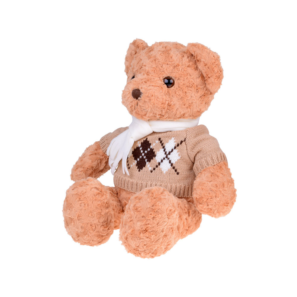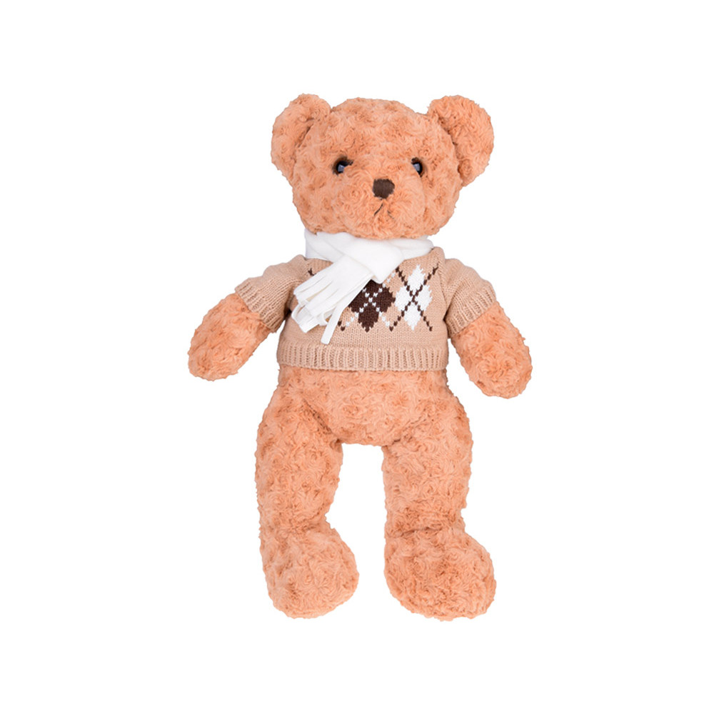 Zdobia ho lesklé hnedé plastové oči a látkový šálik. Plyšový medvedík sa