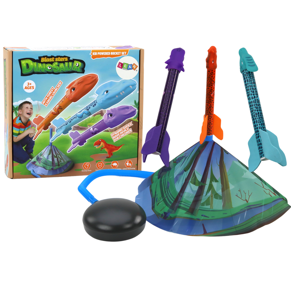 praveku. Súprava obsahuje tri rakety v tvare farebných dinosaurov, čo dodáva