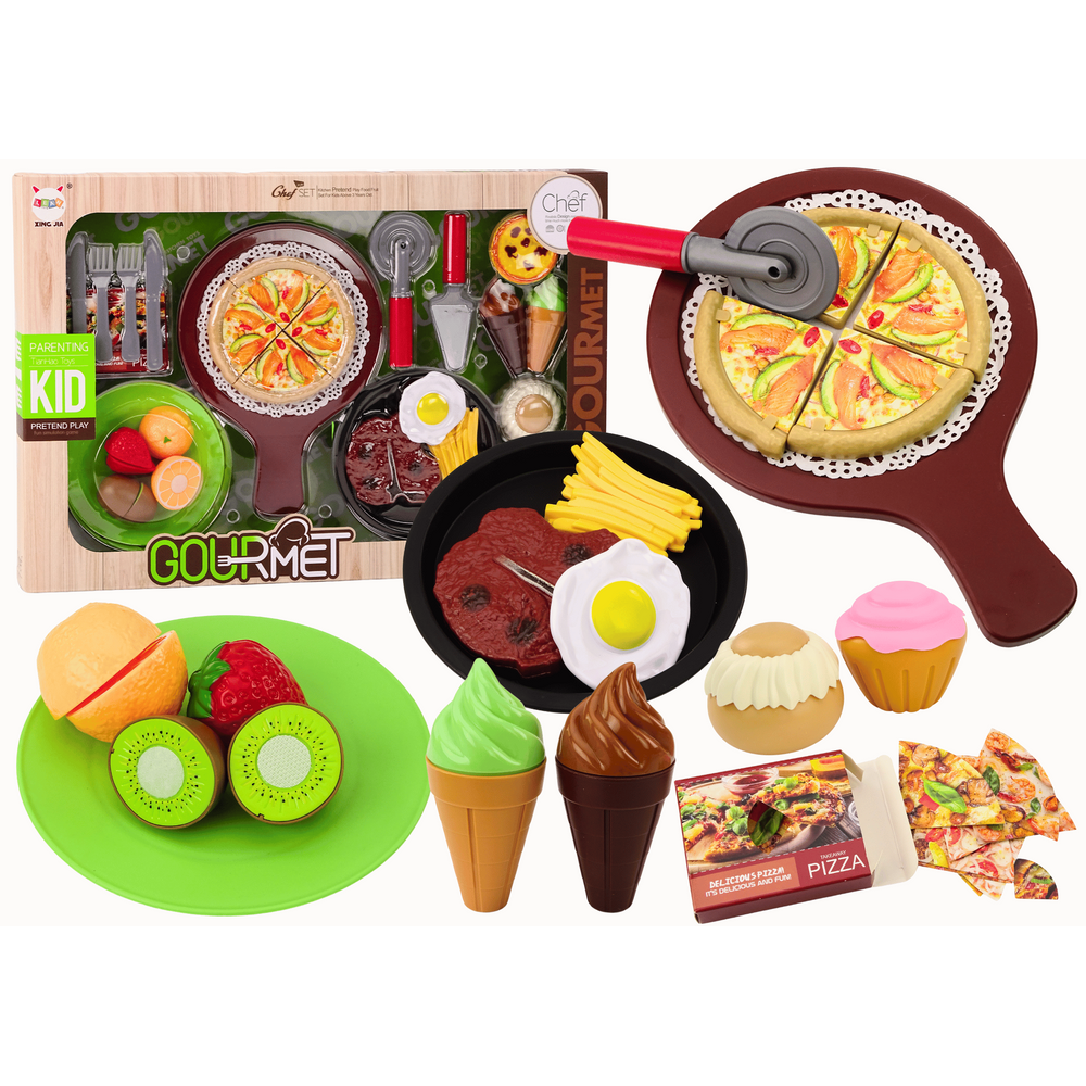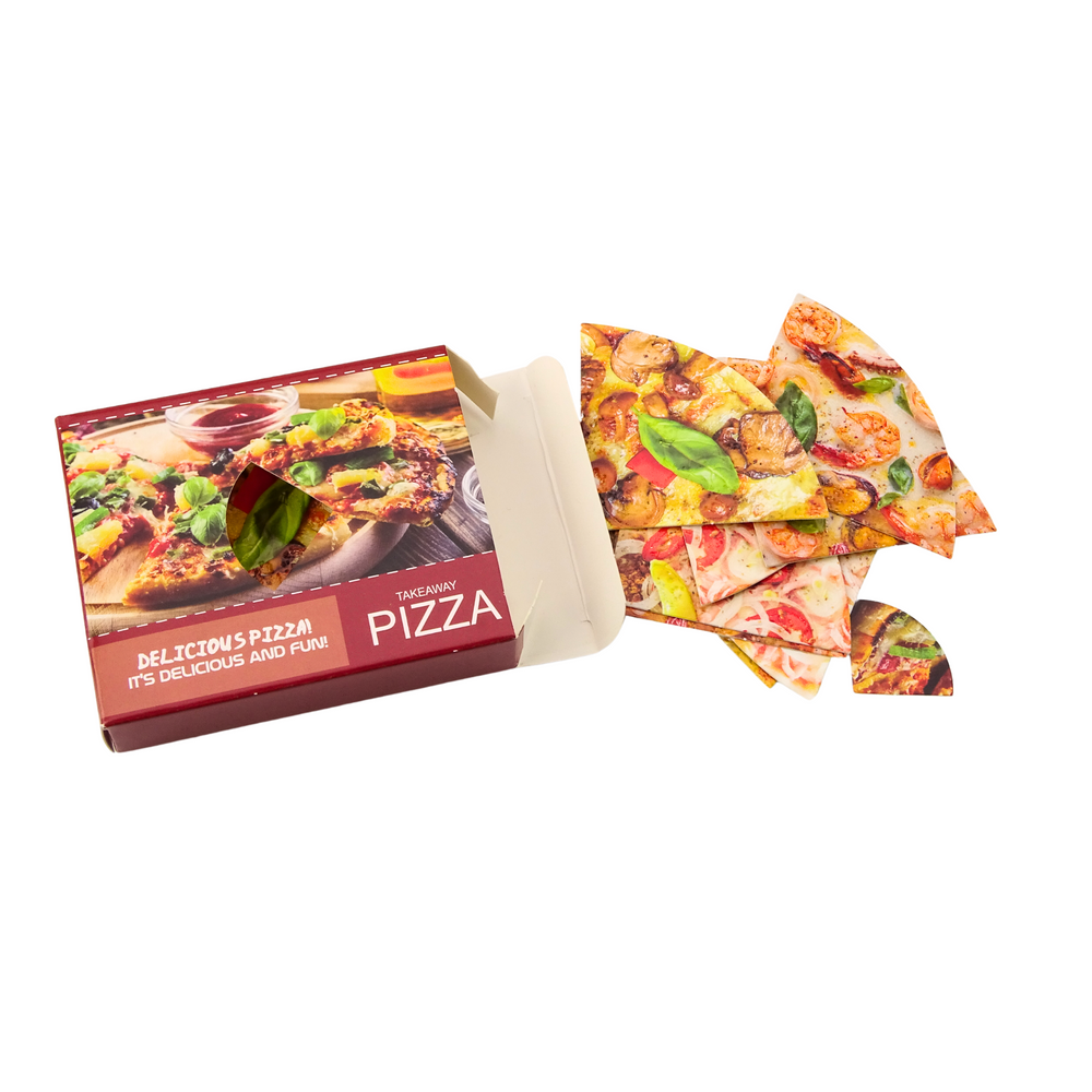obsahuje pizzu rozdelenú na 4 plátky, ktoré si deti môžu poukladať a podávať na
