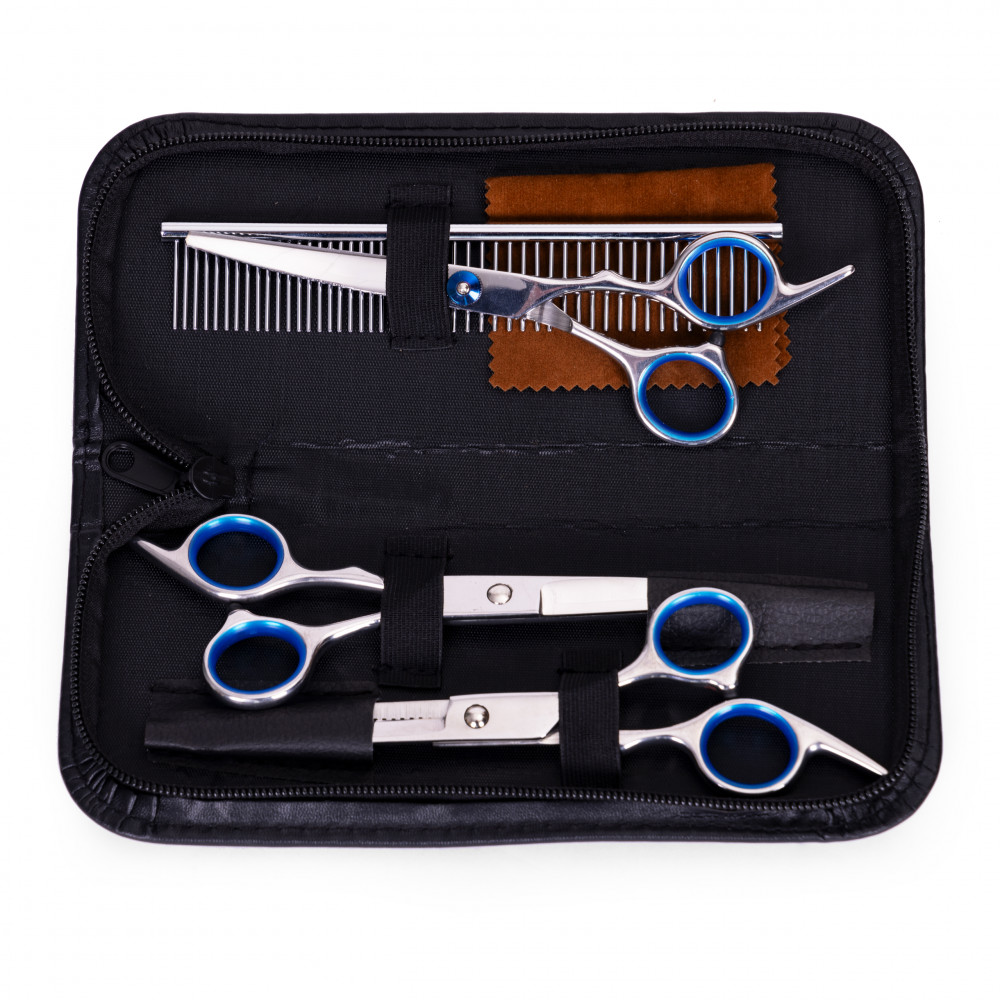 Sada nožníc bola vytvorená pre bezpečné strihanie a úpravu psov a mačiek , zaisťuje presnosť a pohodlie pre majiteľa aj nášho miláčika . Sada obsahuje tri rôzne typy nožníc , ktoré možno prispôsobiť rôznym potrebám starostlivosti. Sada na úpravu navyše obsahuje praktický hrebeň , ktorý dobre poslúži na hladké aj rozcuchané vlasy, všetko zabalené v malom puzdre z ekokože.