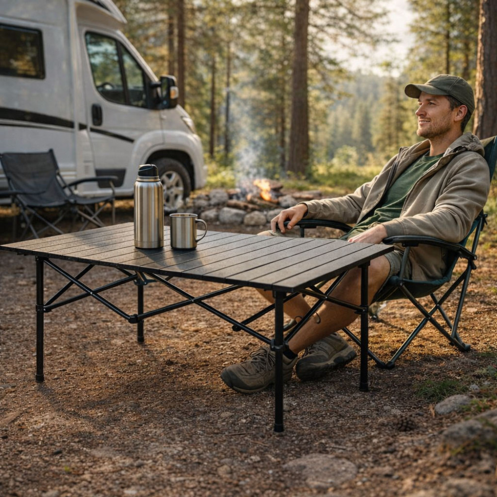 Zrolovaná doska stola vyrobená z dosiek vytvára pohodlný povrch na používanie. Je ideálna na jedlo, prípravu občerstvenia alebo odkladanie nápojov a praktických doplnkov počas kempovania, piknikov alebo grilovania.