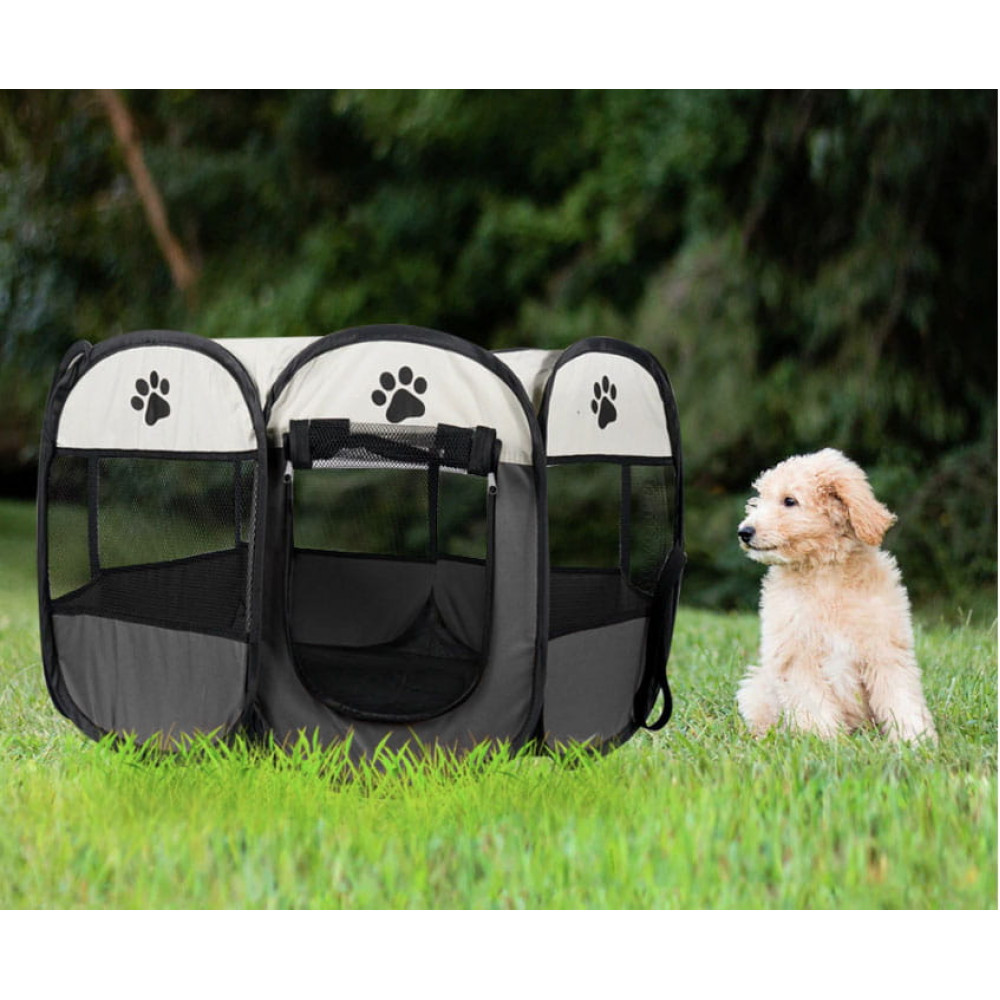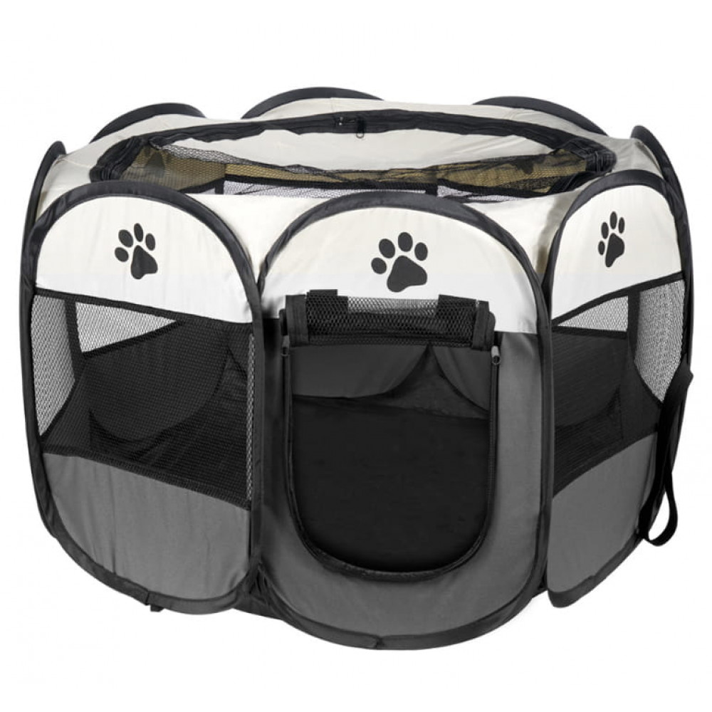 Skladacia textilná ohrádka v tvare osemuholníka, určená pre psov, šteniatka, mačky a malé zvieratá. Ohrádka je ideálnym riešením pre majiteľov domácich miláčikov , najmä keď potrebujú svojim miláčikom poskytnúť bezpečný priestor. Výrobok je vhodný na použitie doma aj vonku.