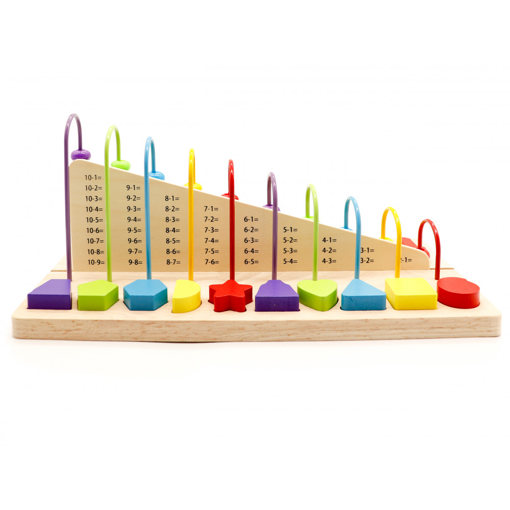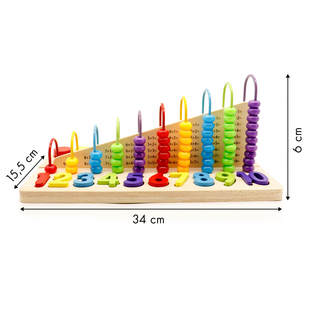 Sada obsahuje drevenú dosku s operáciami sčítania na jednej strane a operáciami odčítania na druhej strane.