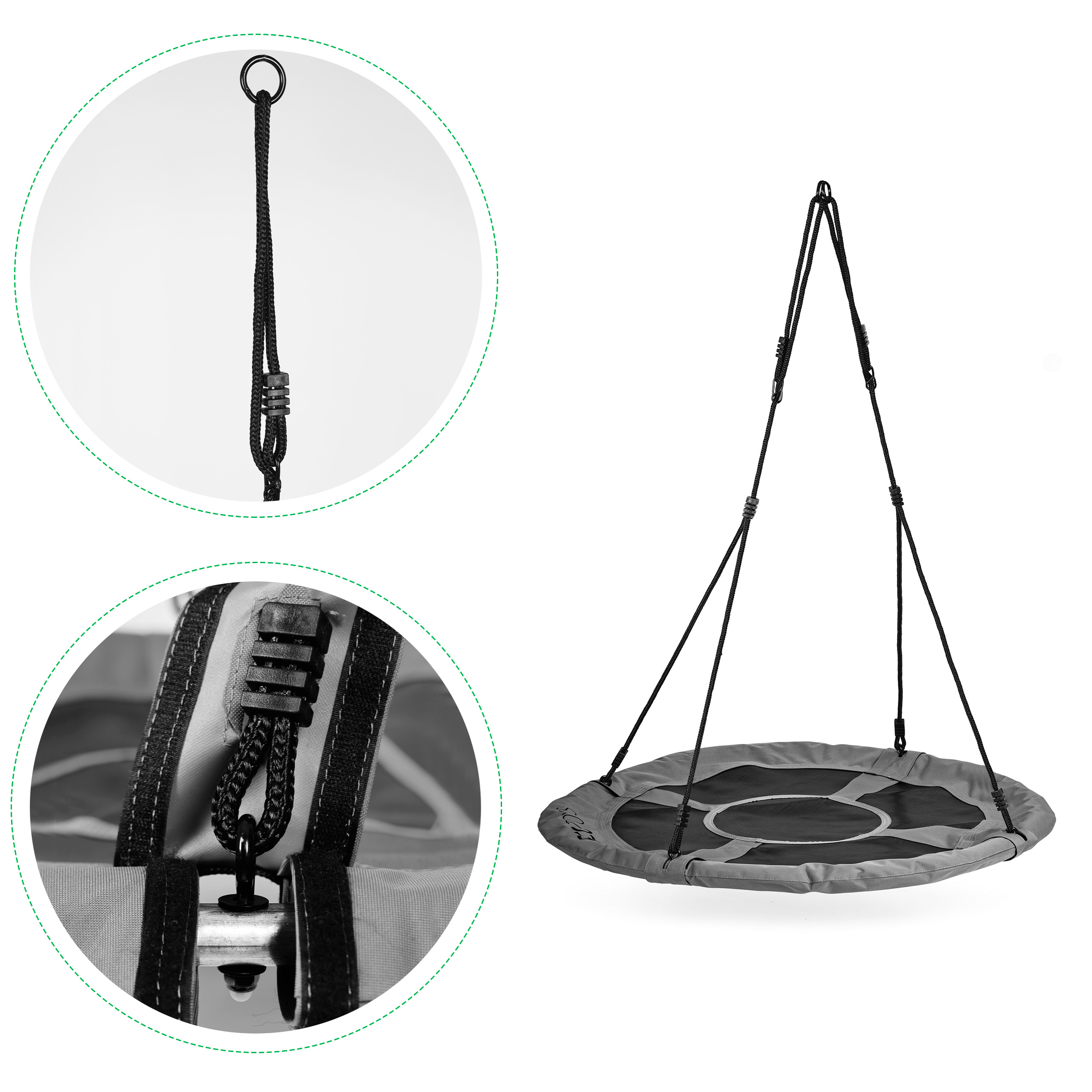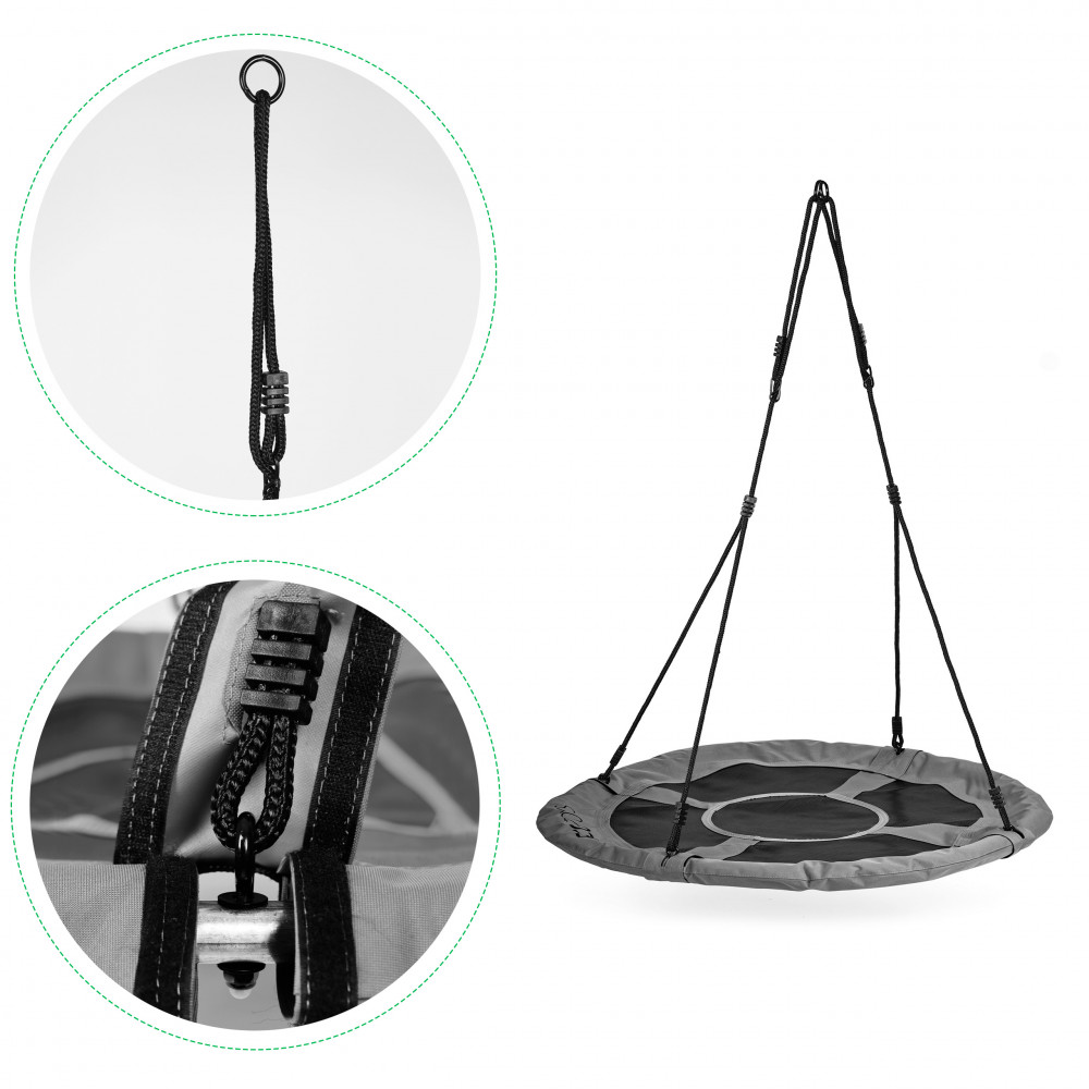 - Hojdačka má 2 nastaviteľné 10 mm hrubé laná z odolného materiálu a pohodlný sedák s priemerom 100 cm , s penovým rámovým čalúnením pre bezpečnosť a pohodlie. Laná sú vybavené kovovými krúžkami na inštaláciu , takže montáž hojdačky je mimoriadne jednoduchá. Môžete ho zavesiť na rám hojdačky alebo konár stromu.