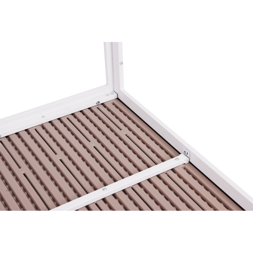 Rám je vyrobený z oceľových profilov, vďaka čomu je celá konštrukcia stabilná a odolná voči deformáciám, na rozdiel od plastových modelov. Spodná strana dosky stola je vyztužená dodatočnými priečnymi profilmi, ktoré zvyšujú jej tuhosť a zabezpečujú dostatočnú pevnosť pri každodennom používaní.
