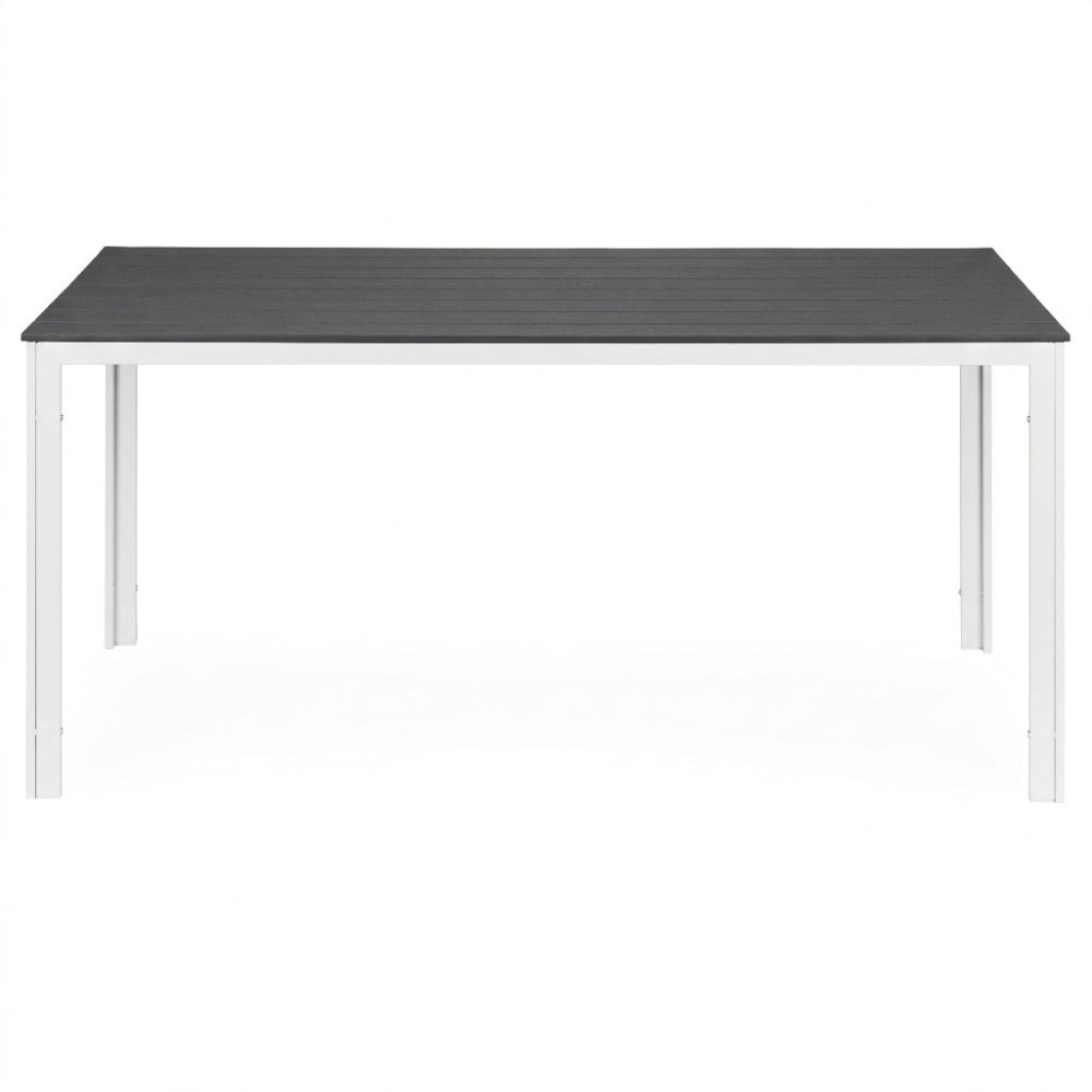 Doska stola je vyrobená zo špeciálneho materiálu polywood, ktorý je odolný voči poveternostným vplyvom. Jeho forma a štruktúra imitujú prírodné drevo, čo dodáva celému kusu elegantný, nadčasový charakter. Malé medzery medzi doskami umožňujú voľný odtok vody počas dažďa, čo zvyšuje funkčnosť stola a uľahčuje jeho každodenné používanie vonku.