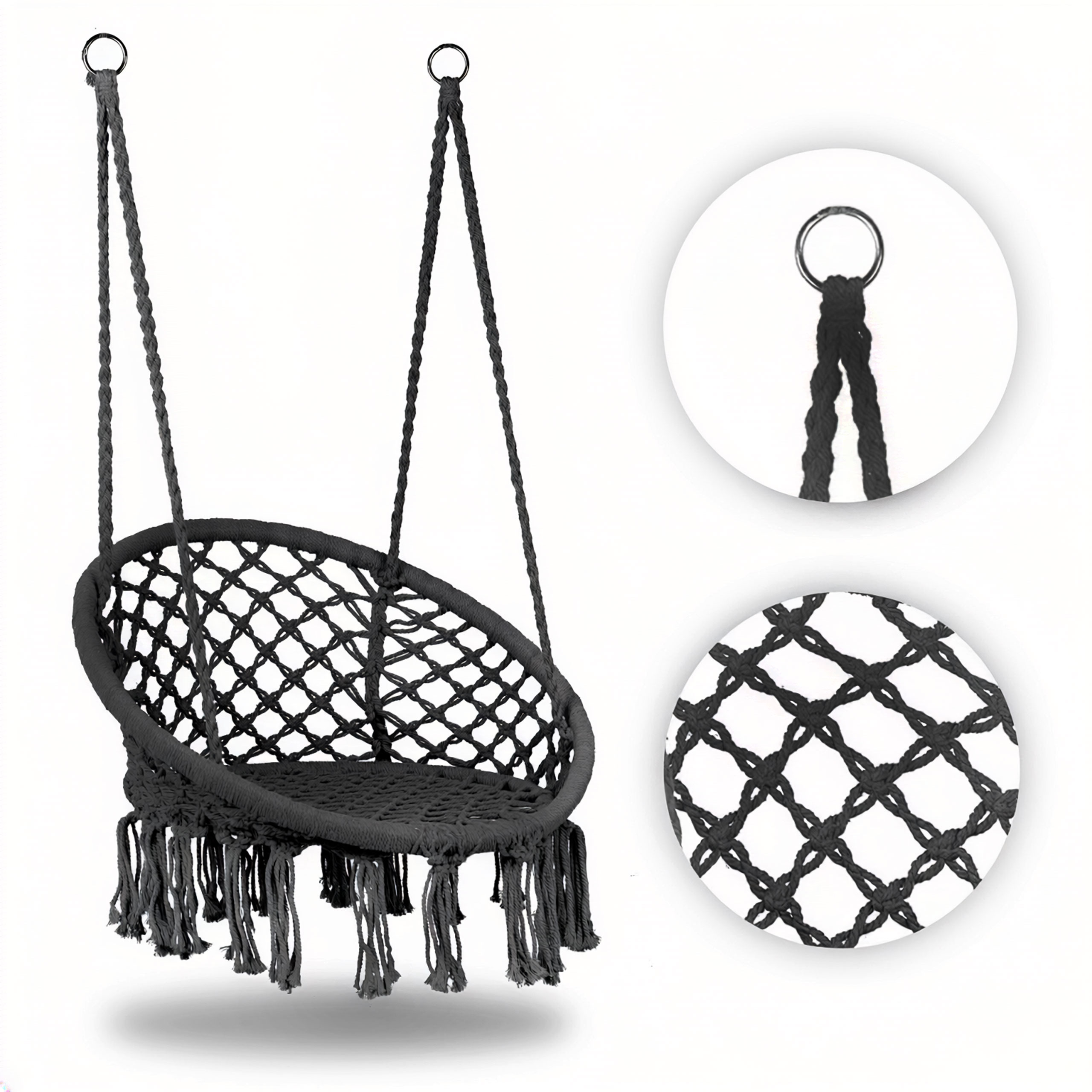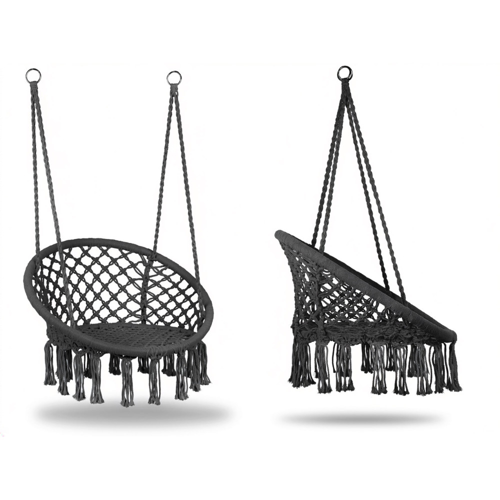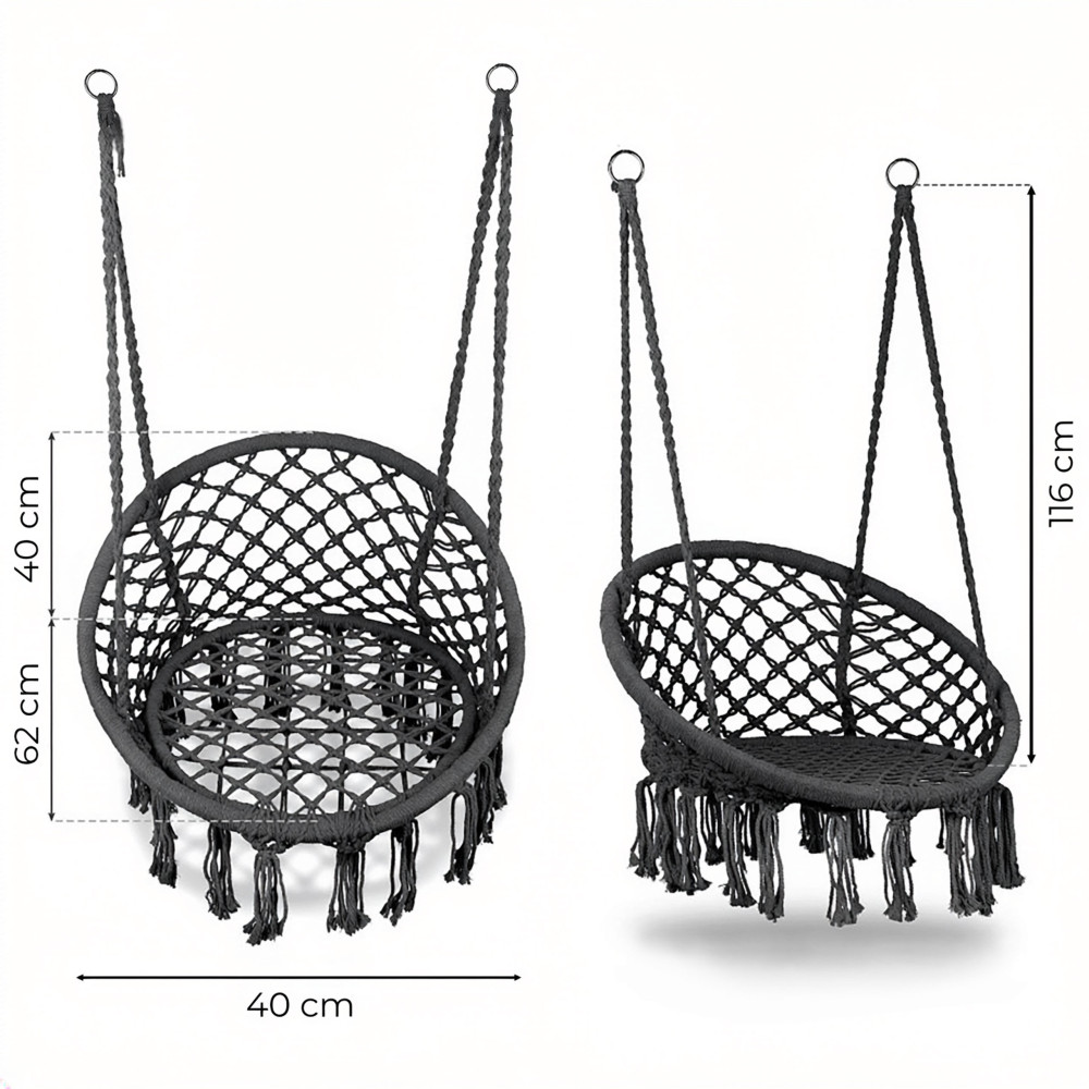 - Stabilné upevnenie na pevných krúžkoch zaručuje bezpečnosť a istotu pri používaní. Konštrukcia umožňuje zavesenie kresla na rôznych miestach – na stropný háčik, stojan alebo trám, vďaka čomu ľahko prispôsobíte spôsob montáže svojmu priestoru.